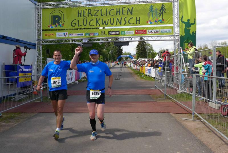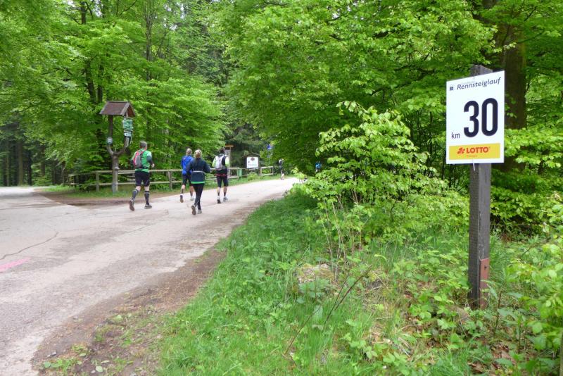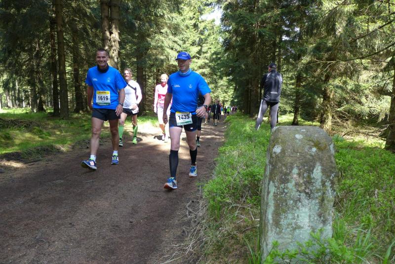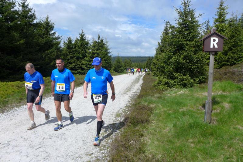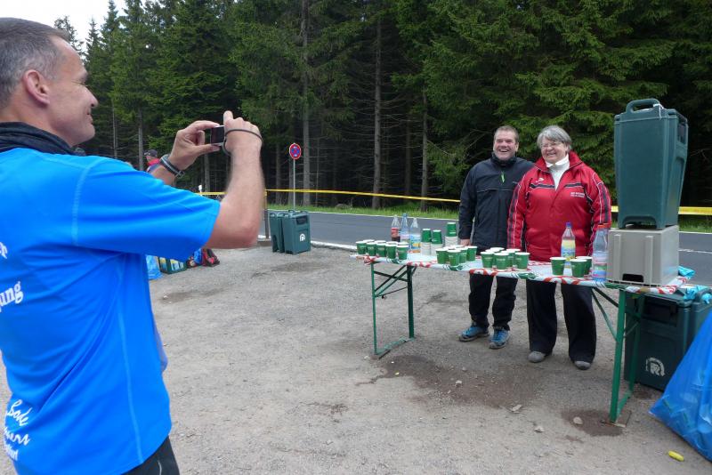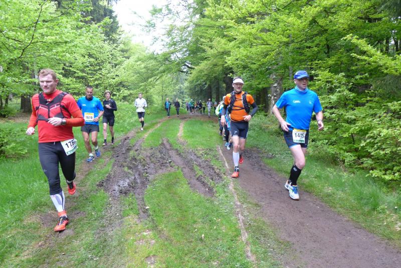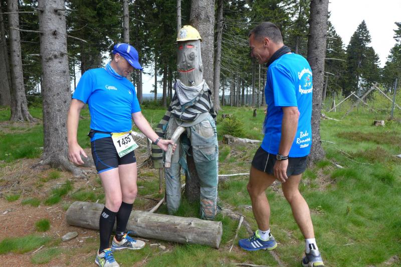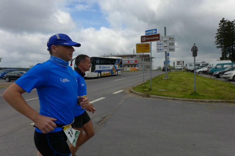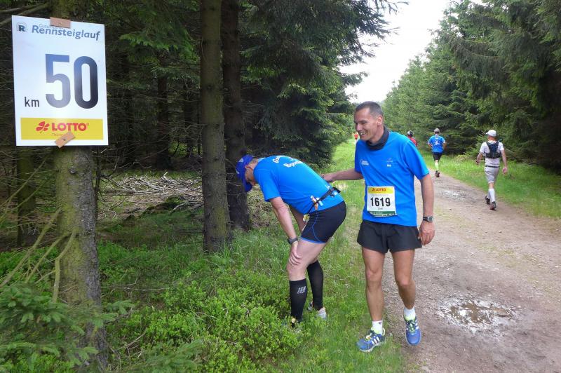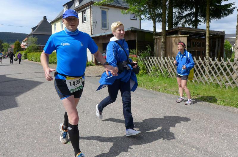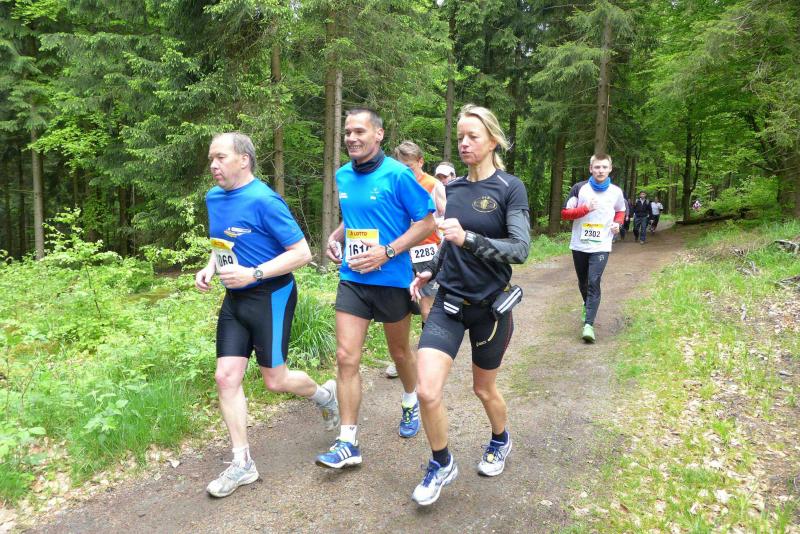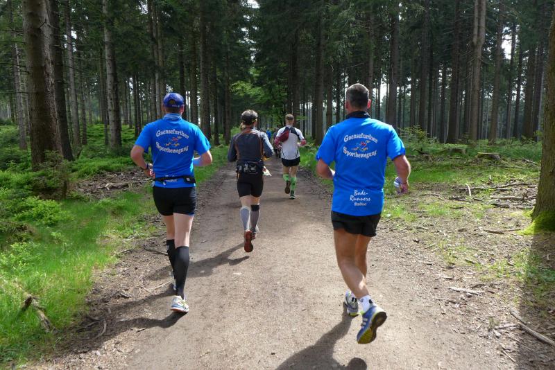 Dem frühen Startschuss um 6.00 Uhr im noch schlafenden Eisenach, gingen viele harte Trainingswochen voraus. Mehrere Marathons, Tempo- und Bergläufe waren absolviert, einzig mit dem Ziel, diesen Ultra-Marathon durchzuhalten. Während es für Jens-Uwe und Sabine Börner der vierte Start zu einem Ultralauf war, bewegten sich Katrin Winkler-Hindricks, Dirk Meier und Jörg Schäper jenseits der 42,195 Kilometer auf unbekanntem Terrain. Leicht fröstelnd, war Kilometer „1“ durch Eisenachs Innenstadt wohl der erste und auch gleich der letzte einfache Abschnitt. Schmunzelnd wurde ein aufgestelltes Ortsausgangsschild registriert, auf dem das Ziel Schmiedefeld mit 72 Kilometern ausgewiesen war. Von nun an ging es bis Kilometer 25,5 stetig bergauf, denn der Große Inselsberg mit 916 Höhenmetern wollte als erstes Etappenziel bezwungen werden. Alle fünf Bode-Runners waren noch dicht beisammen und hatten sich nach drei Stunden Aufstiegsarbeit noch wichtige Körner aufgespart. Bei kühlen fünf Grad Celsius verhinderte dichter Nebel den so hart erkämpften Panoramablick. Zur nächsten großen Verpflegungsstelle "Grenzwiese" ging es rasant bergab auf 746 Höhenmeter. „Das müssen wir nachher alles wieder hoch!“ resümierte Börner und schob sich zur Stärkung lieber noch ein Schmalzbrot in den Mund. Die Frauen beließen es bei warmen Tee und einem schmerzverzerrten Biss in gesalzene Zitronenviertel. Und weiter ging die Reise, jeder in seinem eigenen Tempo. Nicht alle Läufer freuten sich über die inzwischen wärmende Sonne, welche jedoch eine herrliche Sicht vom Höhenweg in das Umland ermöglichte. An der Verpflegungsstation „Ebertswiese“ war die Hälfte der Strecke geschafft. Einen Becher Haferschleim und ein letztes Foto mit Frau Sabine, denn von da an bekam er seine Gattin nicht mehr zu sehen. Beide Frauen spulten Kilometer für Kilometer ab, während in der Männerriege wichtige Fototermine oder Magen- und Muskelprobleme den Vorrang hatten. Ab Kilometer 60 nahm die Strecke einen holprigen Verlauf mit kleinen Hügeln, die inzwischen schon mächtig weh taten. Aber mit "Plänckners Aussicht" auf 973 Metern war der höchste Punkt des Rennsteigs erreicht und als kleine Bergprämie präsentierte man den Läufern die letzten Schneereste. Woher die wohl importiert waren?