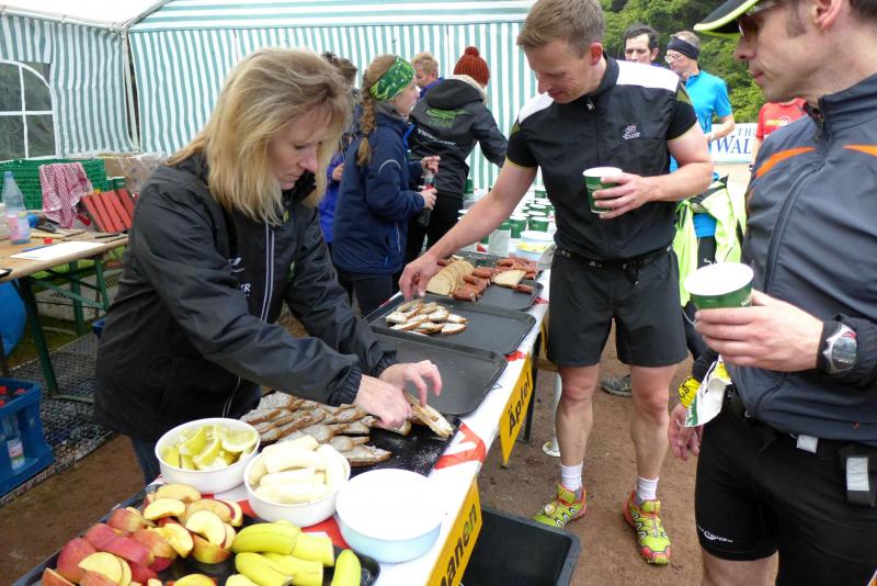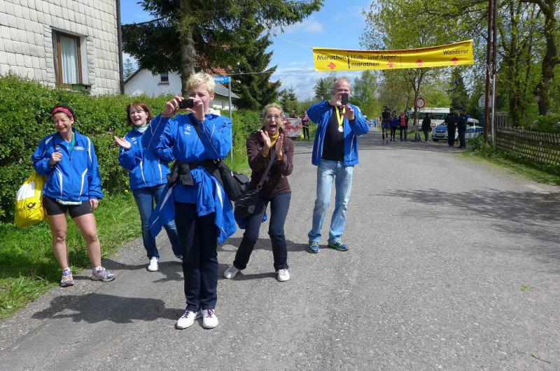 Die beiden Gaensefurther im Ziel hatten indes genug Zeit zum Duschen und warteten zusammen mit dem mitgereisten Fanblock auf die Ankunft der ausstehenden Ultraläufer. Aber auch nach acht Stunden suchte man vergebens nach den blauen Shirts, hätte man zumindest Jens-Uwe Börner längst zurück erwartet (Zielzeit 2013: 07:47:37 Stunden). Umso überraschter bejubelten die Freunde Katrin Winkler-Hindricks, welche nach starken 08:42:32 Stunden ihren allerersten Ultramarathon ins Ziel brachte. Nur sechs Minuten später und damit eine dreiviertel Stunde schneller als im vergangenen Jahr, war mit Sabine Börner auch die zweite Bode-Runners-Frau im Ziel. Bevor man sich dann langsam Sorgen machte, wurde das Männer-Trio zum Glück in der Ferne ausgemacht. Geschafft aber rundum zufrieden, hatten sie sich gemeinsam durchgebissen. Nicht zuletzt auch durch die üppig beladenen Verpflegungsstände. 09:16:00 Stunden Laufarbeit Nonstop hatten die Beine hinter sich. - Ein Ergebnis, dass man natürlich unmöglich so stehen lassen kann! Eine Neuauflage muss her, vielleicht in zwei Jahren. - Dann aber mit dosiertem Training und ohne Würstchen und Schmalzstullen auf dem Weg ins Ziel?