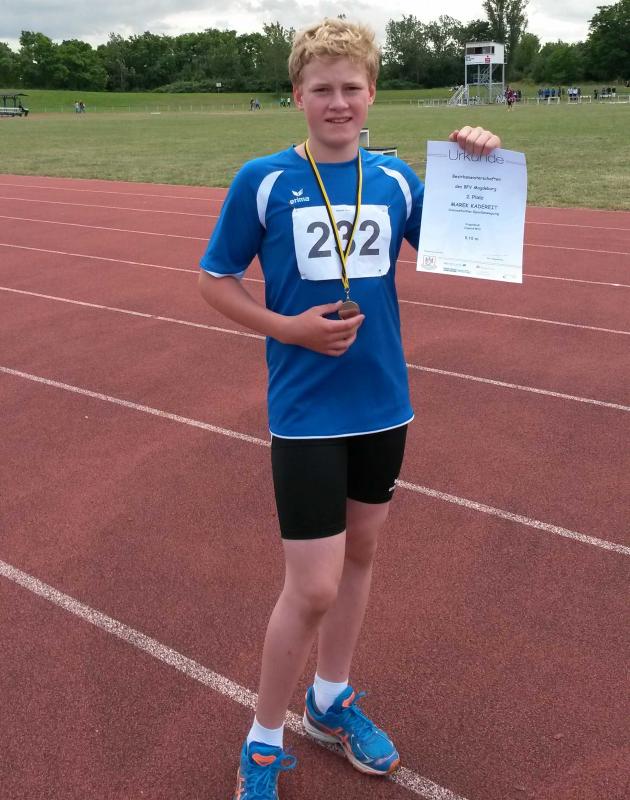 Mit dem Speerwurf, Mareks Lieblingsdisziplin, begann sein Wettkampf. Gleich beim ersten Wurf landete der Speer bei 34,12 m - persönliche Bestleistung. Diese Super-Weite konnte er dann nicht mehr steigern. Am Ende bedeutete das den Sieg und den ersten Bezirksmeistertitel für den Tarthuner. Sein Verfolger aus Stendal hatte mit 30,98 Metern deutlich das Nachsehen. Mit viel Elan ging es in den nächsten Wettkampf - das Kugelstoßen. Der erste Stoß brachte 8,10 m und ließ auf mehr hoffen, aber beim 2. Stoß zeigte der Kampfrichter ungültig an. Er hatte technische Einwände und die Regeln besagen, dass dann der Wurf nicht in die Wertung kommt. Das wiederholte sich mehrfach und verunsicherte den ehrgeizigen Athleten. An eine Steigerung seiner Eingangsweite war so nicht zu denken. Niedergeschlagen ging Marek aus diesem Wettkampf. Um so überraschter waren alle, als dann zur Siegerehrung aufgerufen wurde und er mit seinen 8,10 m vom ersten Versuch den 2. Platz belegte. Den 75 m Vorlauf bestritt Marek mit einer Zeit von 10,73 s in persönlicher Bestzeit. Damit war er 5. und für den Endlauf qualifiziert. Jedoch meldete sich nach dem Lauf wieder seine alte Verletzung und er überquerte als 8. in 11,10 Sekunden die Ziellinie.