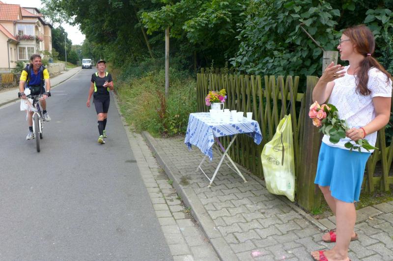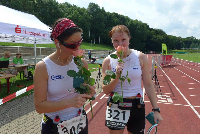 Drei weitere Starterinnen der Gaensefurther Sportbewegung nutzten den Ottonenlauf als erste lange Trainingseinheit für einen anstehenden Herbstmarathon. „Ein gutes, gleichmäßiges Tempo habt ihr Frauen immer!“ resümierte Ronald Kijok vom SV Concordia 1920 Nachterstedt und passte seinen Schritt den Bode-Runners an. Auch die Nordhessin Antje Hollstein reihte sich mit ein. Sie war mit der ganzen Familie angereist und belief auf diese Art und Weise die landschaftlich reizvolle Harzregion. Nach der Verpflegungsstelle am Osterteich trennten sich die Wege dann wieder. Petra Becker kam am besten mit den Bedingungen klar. Für jede Bergerklimmung belohnte sie sich mit einem kleinen Leckerli aus ihrem Laufgürtel und auch die Hitze konnte dem Blondschopf unter dem weißen Käppi nicht wirklich etwas anhaben. Sylvia Köhn und Sabine Börner stöhnten sich die Berge gemeinsam rauf. Nach 345 erreichten Höhenmetern und einem lauten Jubelschrei am Hagentalblick, ließen es die beiden hinab nach Bad Suderode locker austrudeln. Nun standen nur noch sechs heiße Kilometer an, die man Dank ausreichender Verpflegungspunkte gut getränkt absolvieren konnte. Die Eindrücke vom Zieleinlauf im Quedlinburger Stadion hielten noch an, da klatschte auch Kijok zufrieden ab. Sein grünes Finisher-T-Shirt, welches er sich extra für seine Ottonenläufe angeschafft hat, wird demnächst um einen weiteren Aufdruck ergänzt werden müssen. Unter respektvollem Beifall liefen viele weitere Sportler der Marathon- oder Ultradistanz über 69 Bergkilometer von Stiege bis nach Quedlinburg ein. Das wäre doch mal ein Gaensefurther Projekt für die kommende Laufsaison.