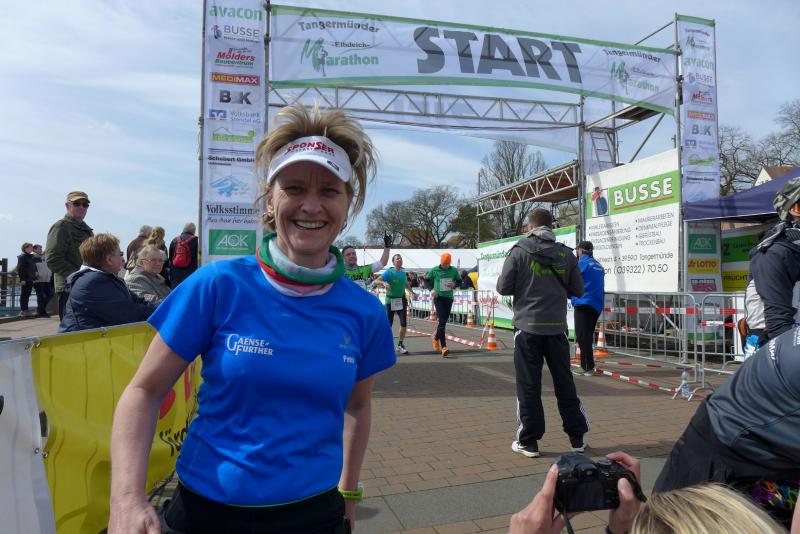 Während sich alle Bode-Runners zum Startfoto aufreihten, fehlte einer bereits. Die Marathonläufer waren schon gestartet und Janko Schlenker verfolgte als einziger Gaensefurther das Ziel, über 42,195 Kilometer zu finishen. Üblicher Weise als Triathlet unterwegs, sollte es der erste Marathon in seinem Leben werden. Die Zielsetzung war klar: Ankommen und mehr nicht! Dabei waren die Umstände für so eine erste Lebenserfahrung alles andere als einfach. Bereits nach dem Start war man gut beraten, sich einer größeren Gruppe anzuschließen, denn der böige Wind drückte gnadenlos. Im geschützten Bölsdorf kam der zweite Verpflegungspunkt zum Kräfte sammeln genau richtig. Nach gut sieben Kilometern bog die Strecke ab in Richtung Buch. Endlich Rückenwind! Die nächsten vier Kilometer waren aber trotzdem kein Kinderspiel, denn nun brannte die Sonne. Wer sich jetzt nicht auf die Strecke konzentrierte, verlor schnell die Orientierung. Durch zu laufende Schleifen und einer Wende bei Kilometer 14 begegneten sich die Läufer mehrmals. Sechs Kilometer vor dem Ziel ging es dann wieder schnurstracks geradeaus, die Elbe rechter Hand als ständiger Begleiter. Inzwischen wurden die Windböen als angenehm gewertet, bis auf den letzten Kilometer, der noch einmal mächtig an den Kräften zehrte. Die Zehn-Kilometer-Läufer waren schon wieder im Ziel, als dann auch alle Halbmarathonläufer eintrafen. Geschafft vom schnellen Tempo und dem Kampf mit den Elementen, registrierte man auch Schlenker, der den Zielbereich passierte. „Alles Gute!“ wünschten die Sportfreunde für die zweite Runde und „Du schaffst das!“ Keiner hätte in diesem Moment wohl tauschen wollen. Die Ergebnisse des Testlaufes bescheinigte indes allen ein beruhigendes Gefühl. Dirk Meier blieb respektvoll unter 01:30 Stunden, Jens-Uwe Börner und Jörg Schäper grienten über beide Ohren und auch Sylvia Köhn und Lutz Klauß klatschten zufrieden ab. Sabine Börner blieb knapp über ihrer Zielzeit. Hier muss in den letzten drei Trainingswochen noch härter gearbeitet werden! Ganz relaxt trudelte dann Petra Becker ein: „Och, war das ein schöner Lauf!“ Inzwischen konnten alle wieder lachen und Recht hatte sie! Ein Gang runter und es hätte wirklich auch noch Spaß gemacht.