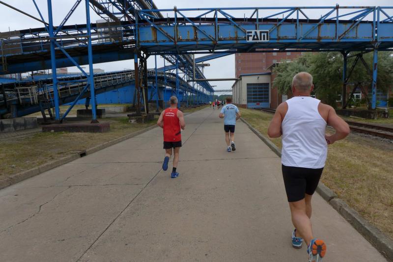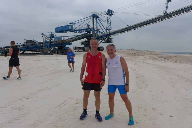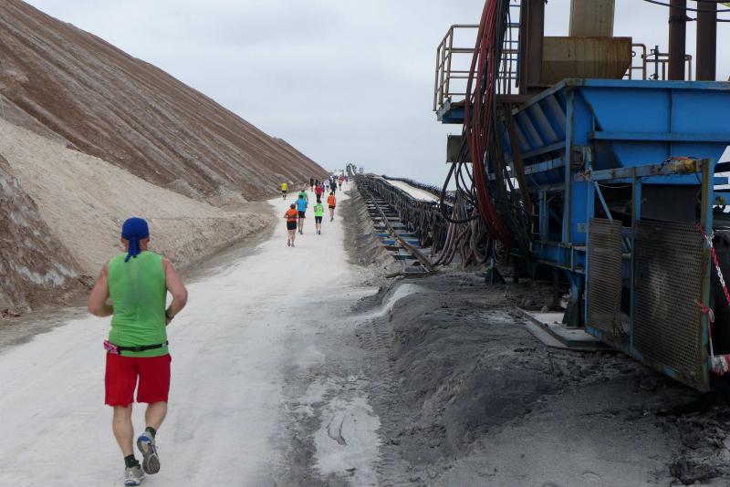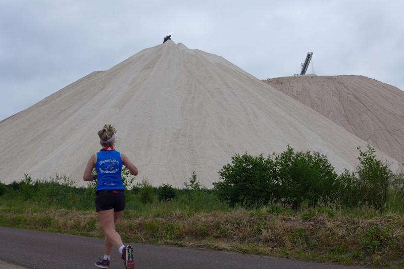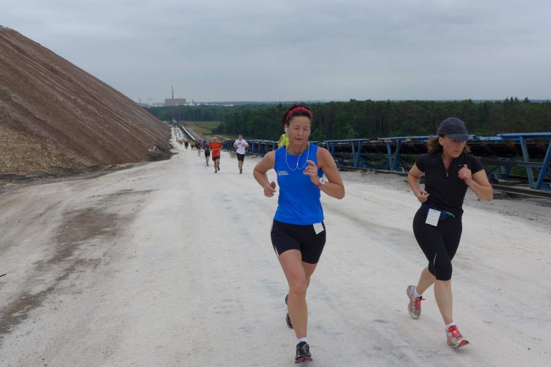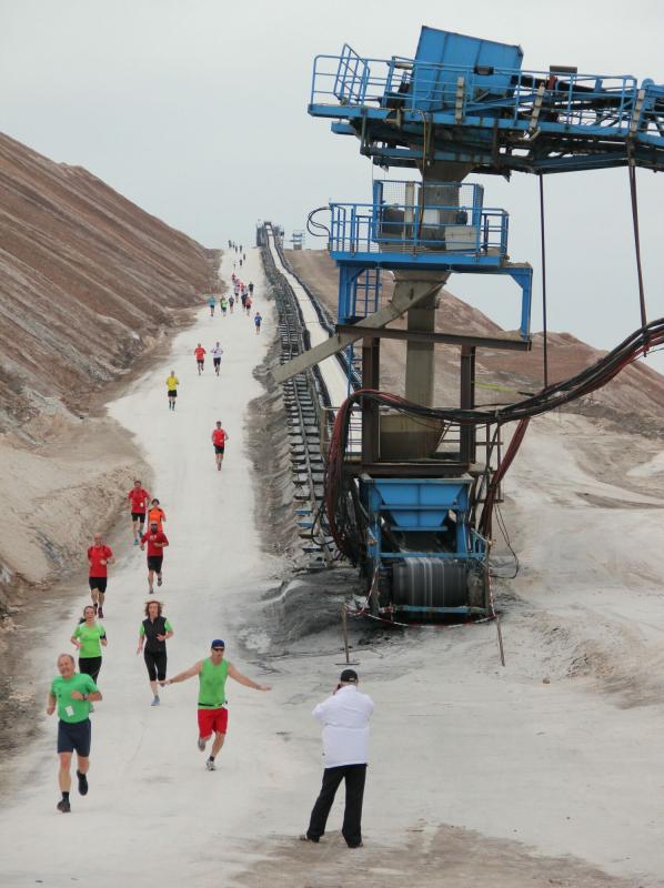 Am ersten Getränkestand noch einmal aufgetankt, lag er dann in seiner vollen Dimension vor den Läufern: Der berühmt, berüchtigte Kalimandscharo. Nun kam nicht nur für die Läufer der erste Anstieg - auch für das Förderband ging es bergauf. Der Weg auf dem hellen Abraummaterial blendete extrem. Verflixt, gab es doch beim Start bei bedecktem Himmel garkeinen Grund für den Einsatz von Sonnenbrillen.