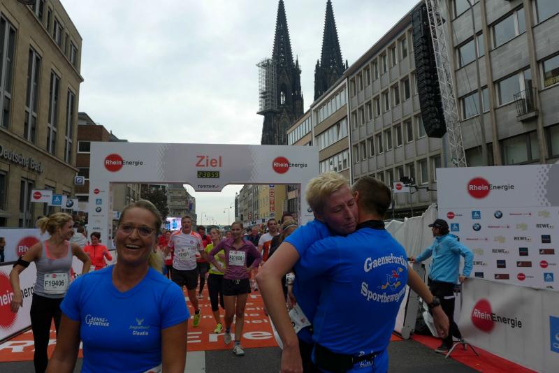 Unter den knapp 6000 Teilnehmern quälten sich auch Dirk Meier und Sabine Börner über die 42,195 Kilometer. Meier, der nach wie vor seinen Traum von 2:59 Stunden träumt, hatte sich entsprechend seinem Trainingszustand beim 3:15 Stunden Zeitläufer einsortiert. Mit angezogener Handbremse folgte er diesem Tempo bis Kilometer 35. Den Schmerz ausgeblendet, konnte er im letzten Drittel noch einen Gang zulegen. Börner hingegen schloss sich vorerst dem 4:00 Stunden Zeitläufer an. Aber bereits ab Kilometer neun musste sie abreißen lassen. Dies hatte sich schon bei den Tempoläufen im Training angekündigt. Als dann bei Kilometer 26 die Freunde an der Strecke standen, liefen erstmal dicke Kullertränen. „Bine, umkehren wäre jetzt aber auch blöd!“ Recht hatten sie und so weit hinten auf der Strecke offenbarte sich viel schlimmeres Elend. Vom hinkenden Läufer über krampfende Gestalten bis zum Totalausfall. Also dann lieber im Wohlfühltempo die Strecke genießen. Mit einem Stieleis in der Hand, reihte sich eine Läuferin wieder in den Trupp: "Sorry, ich muss mich hier irgendwie motivieren!" Gelächter in den Reihen, Applaus von den Zuschauern. Auf den letzten drei Kilometern durch die Kölner Innenstadt drängten sich die Zuschauer immer dichter und trugen die Aktiven förmlich in das Ziel. Der Dom war das Ziel, imposant empfing er alle Finisher.