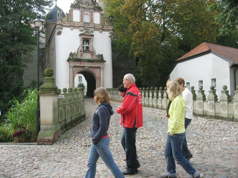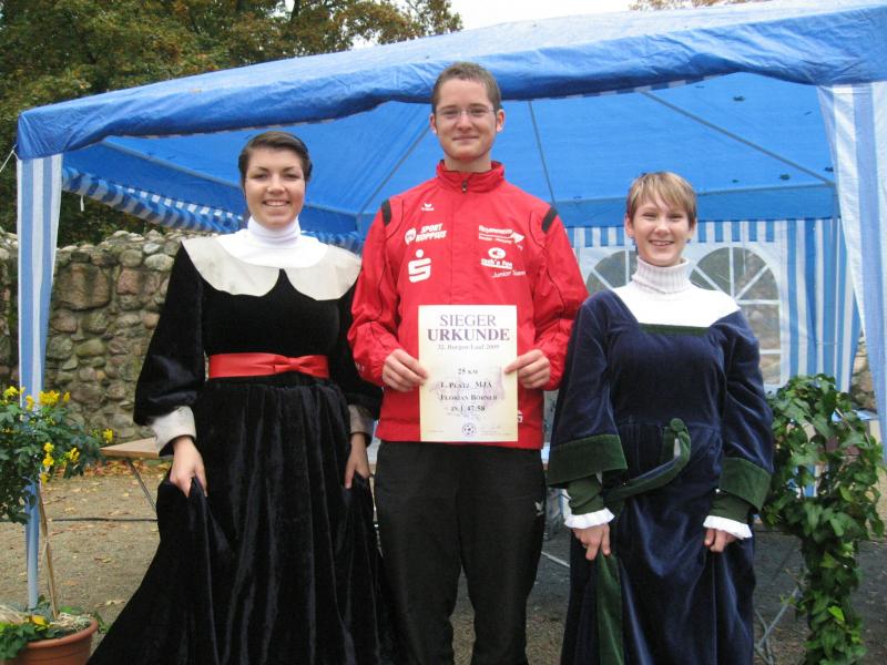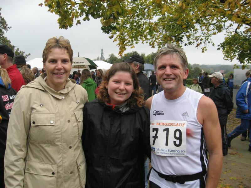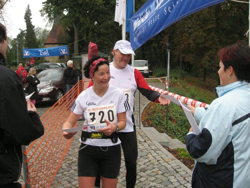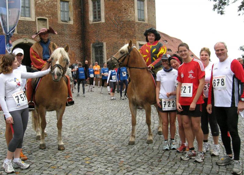 Als „Mutter aller Läufe“ unter Insidern benannt, zog sich am vergangenen Sonntag der Belziger Burgenlauf über 25 Kilometer durch die bunte Herbstlandschaft. Etwas länger als ein Halbmarathon und bergauf, bergab durch den Hohen Fläming, gingen acht Starter der Gaensefurther Sportbewegung diesen Crosslauf als letzte Vorbereitung für den Rügen-Brücken-Marathon an. Die Strecke war gut präpariert, hatte es doch am Vortag ordentlich geregnet. Und noch beim traditionellen Ehrenstart auf Burg Eisenhardt, drohten dunkle Regenwolken. Doch der guten Stimmung in dem großen Starterfeld machte dies keinen Abbruch. Bei angenehmen 12 Grad Celsius und leichtem Nieselregen ging es zusammen mit den acht Kilometerläufern auf die Strecke. Vom historischen Belziger Marktplatz mit seinen ca. 100 Höhenmetern über NN, kämpfte man sich nun allmählich bis auf 190 Meter hoch. Nur mit erhöhter Aufmerksamkeit und gegenseitiger Rücksichtnahme bewältigten die Sportler Stein- und Sandwege, Wurzelwerk oder durchnässte Grasnarben. Mitunter waren die Trampelpfade um die großen Pfützen für die hinteren Läufer nur noch gehend zu überqueren. Erleichterung für Renate Liedtke und Tina Börner, als sich die Acht-Kilometerstrecke vom restlichen Teilnehmerfeld trennte. Bevor es wieder bergauf ging, konnten sie sich auf der leicht abschüssigen Strecke erst einmal erholen. Nach nicht einmal einer Stunde erhielten sie bereits ihre Teilnehmerurkunden vom zuständigen Burgfräulein. Nun hieß es sich die Zeit zu vertreiben, bis die Langsteckler einlaufen.