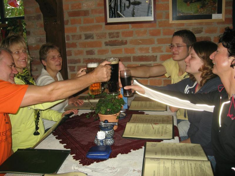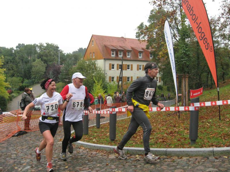 Nicht viel Zeit für die malerische Landschaft und die gut bestückten Verpflegungsstände nahm sich Petra Becker. Im Sauseschritt eilte sie dem Ziel entgegen und überquerte nach bereits 2:14 Stunden die Zeitmessung. Platz drei bei den Frauen in der W40, womit sie nun auch die Hitliste der schnellsten Zeit im Staßfurter Damenteam anführt. Ernste Worte gab es dagegen im Duo Lutz Klauß und Sabine Börner: „Bine verschieß nicht deine ganzen Körner! Denke dran, in einer Woche ist Marathon!“ Und so wurde das Tempo immer wieder herausgenommen. Dementsprechend locker und leicht erreichte man wieder Burg Eisenhardt, wo man nach ausreichend Matsch und Schlamm sehnlichst der warmen Dusche entgegen wanderte.