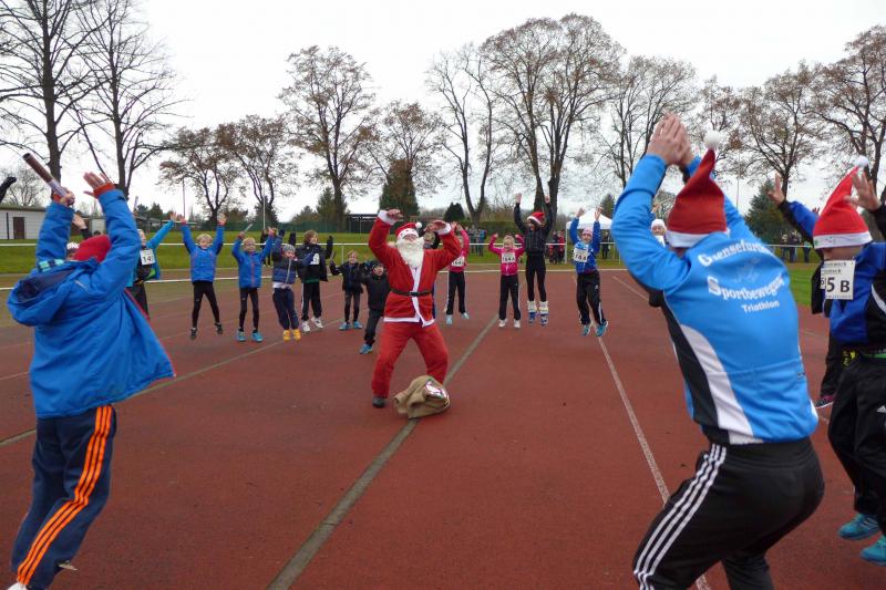 Der Wettergott meinte es wieder einmal gut mit den Bode-Runners der Gaensefurther Sportbewegung. Die neunte Auflage im Staßfurter Stadion der Einheit konnte problemlos gestartet werden und mit fast 100 Teilnehmern wurde es auf der Tartanbahn auch so bunt, wie es sich die Organisatoren gewünscht hatten. Krankheitsbedingt minimierte sich der Lauf über 200 Meter der Vorschulkinder auf nur wenige mutige Starter. Eingewiesen vom Nikolaus höchstpersönlich, vertraten sie ihre Altersgenossen aber prächtig. Erstaunlich fit präsentierten sich die Sechs- bis Zehnjährigen Zweier-Teams. Nach einer Erwärmung mit dem Nikolaus, bei der auch die Lachmuskeln nicht zu kurz kamen, lieferten sich die Mädchen und Jungen über 15 Minuten ein spannendes Kopf- an Kopfrennen. Nur das Ausmessen der letzten Meter besiegelte am Ende die hart umkämpften Platzierungen zwischen der Grundschule Hecklingen und der Gaensefurther Sportbewegung.