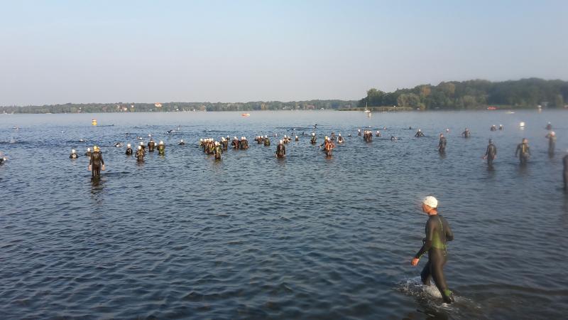 Am Wannsee in Berlin gab es eine Neuauflage des BerlinMan, die auch Familie Lampe zum Mitmachen animierte. Der männliche Teil der Familie war schon lange angemeldet, doch Annett ließ sich mit ihrer Teilnahmeentscheidung Zeit. Leider zu viel, wie sich rausstellte, denn die Startplätze waren am Wettkampftag alle vergeben. Enttäuscht blieb ihr nur übrig, ihren Männern die Daumen zu drücken. Aber es kam für sie noch schlimmer. Mit Entsetzten stellte sie fest, dass der Neoprenanzug von Matthias zu Hause vergessen wurde. Die Hoffnung auf ein Verbot, dass ab 23 Grad Wassertemperatur ausgesprochen wird, erfüllte sich nicht, denn die Säule des Termometers blieb bei 22,3 Grad stehen. Bei einem Mitteltriathlon ist der Neo von Vorteil, zumal in Berlin die Schwimmstrecke 2,2 km beträgt anstatt sonst 1,9 km über diese Distanz. Und das bei Matthias Vorhaben, die 5 Stunden Marke knacken zu wollen. .... Ein harter Kanten und er weit und breit allein ohne Neo.....Am Ende hat alles dennoch gut geklappt. Er kam glücklich ins Ziel, super Radzeit und mit dem Lauf war er auch zufrieden. Keine Krämpfe, keine Schmerzen und das bei 32 Grad. "Es geht also auch ohne", freute er sich über seine Leistung. Seine Zeiten von 49:12 Minuten Schwimmen (inklusive Treppenaufstieg 88 Stufen), 2:41:28 Stunden für 90 km Radfahren und 1:38:39 Stunden für 20 km Lauf können sich sehen lassen, obwohl er mit einer Endzeit von 5:09:19 Std. sein persönliches Ziel nicht ganz erreicht hat. Als 27. in AK TM40 von 69 Teilnehmern und 194. von 488 Männern erschien er auf den Ergebnislisten.