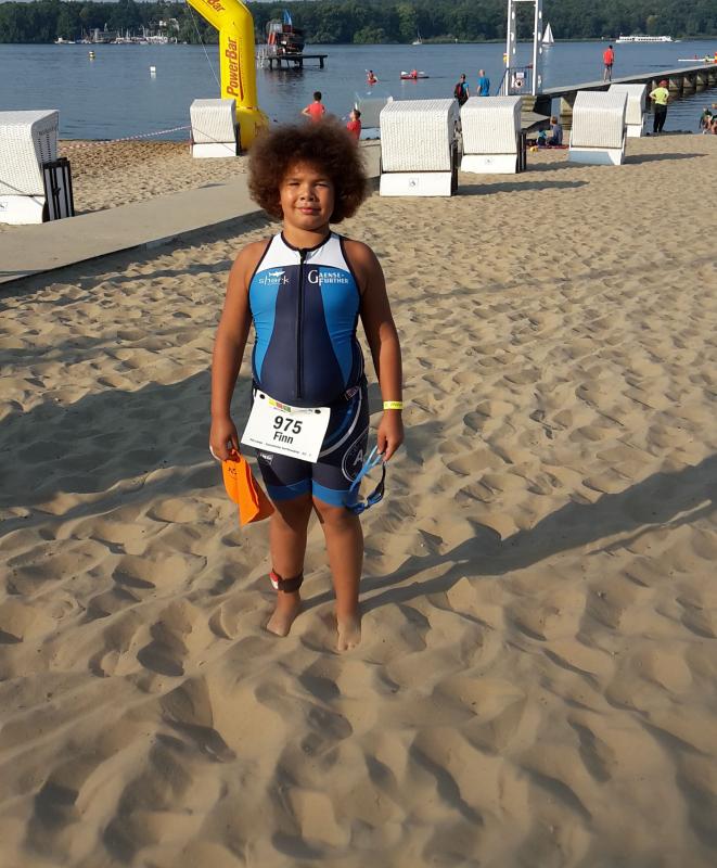 Als der letzte Schwimmer aus dem Wasser kam wurden die Kinder in 3 Wellen gestartet. Finn war in der ersten Gruppe vom Mini Man Schüler C. Es starteten 21 Schüler mit ihm. Es war ein Swim & Run Wettkampf mit 100 m schwimmen und 500 m laufen. Finn kam als 5. aus dem Wasser, wurde gesamt 7. und 5. Junge. Es hat ihm großen Spaß gemacht, auch wenn er vor der Treppe großen Respekt hatte. Bis auf einige Stufen war er durchgehend laufend unterwegs, was nicht mal den Erwachsenen gelang. Am meisten freute er sich über die gute Schwimmposition. Es war sein erster Wettkampf, den er durchgekrault hat. Glücklich im Ziel angekommen, begab er sich dann mit seiner Mutter an die Radstrecke, um den Papa anzufeuern. Für den nächsten Berlin Man in 2 Jahren haben die Lampes vor, sich alle 3 wieder anzumelden.