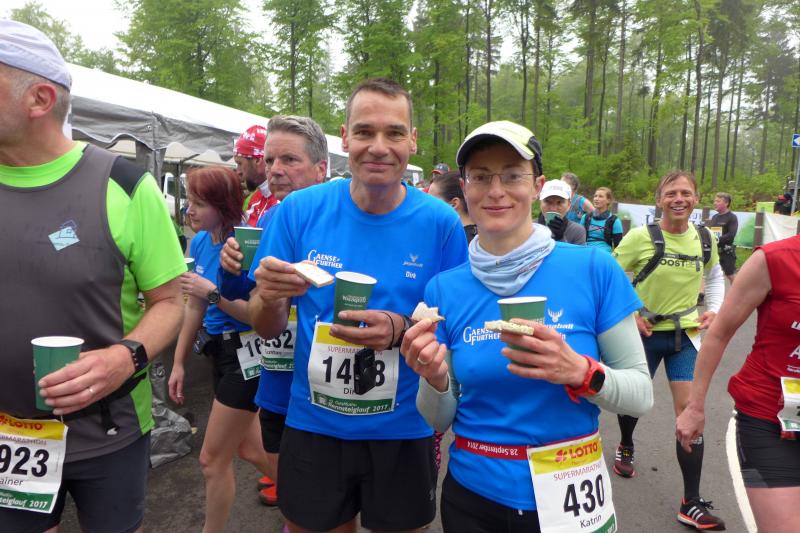 Bei den Gaensefurthern lief alles gut. Katrin Winkler-Hindricks hatte sich erwartungsgemäß mit Dirk Meier ins vordere Feld abgesetzt. Jörg Schäper konnte trotz geringerer Trainingsläufe lange mit den beiden mithalten und fand am Ende sein eigenes Tempo. Jens-Uwe Börner verausgabte sich wie immer auf den ersten 30 Kilometern um genügend Fotos von den Spitzenläufern einzusammeln. Erst dann lies er sich zurückfallen um mit dem Köhn-Börner-Duo den Rest des langen Weges zu bestreiten.