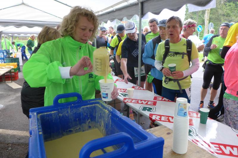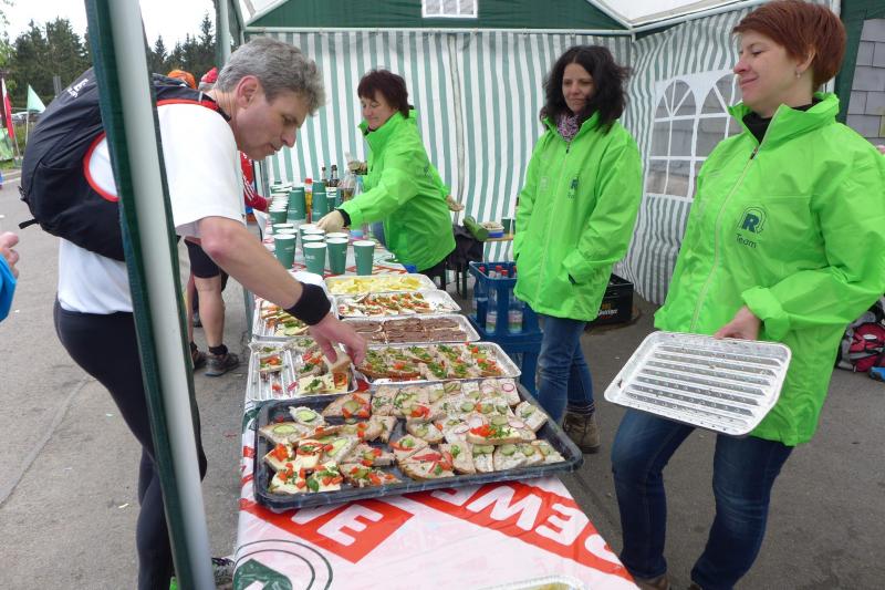 Der aufkommende Hunger wurde an der Verpflegungsstelle "Grenzwiese" traditionell mit Haferschleim besiegt. Es gab aber auch Stullen mit diversen Aufstrichen, Obst, Kuchen und natürlich ausreichend Wasser und warmen Tee. Die Männer aus den Reihen der Bode-Runners konnten der Versuchung nur schwer wiederstehen, war die Erinnerung an heftige Magenprobleme bei der 42. Auflage des Rennsteiglaufes doch noch nicht vergessen. Und überhaupt musste nun langsam Fahrt aufgenommen werden, galt es doch die damalige Zielzeit von 09:16 Stunden zu unterbieten.
