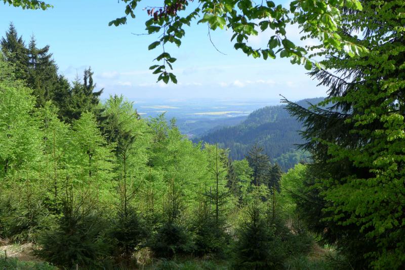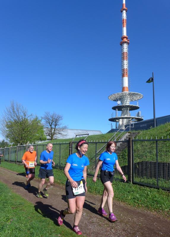 Mit "Hoher Schorn" auf 850 Metern war dann der dritthöchste Aussichtspunkt der Strecke erreicht. Schnell ein Foto mit Uwe vom Team Frankenwild, denn Uwe war an einem ganz anderen Punkt angekommen. Er wollte schlicht und ergreifend aufgeben, hatte genug gesehen vom Höhenweg des Thüringer Waldes, ihm tat einfach alles weh. Da hatte er aber die Rechnung ohne die Bode-Runners gemacht, die alles daran setzten, ihn wieder auf Trab zu bringen. Die Karawane zog weiter und euphorisch wurde das Kilometerschild „50“ gefeiert!