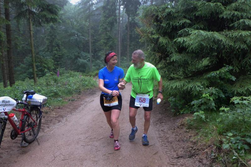 8:45 Uhr: Hand in Hand schritt ein Pärchen den Beerberg hinauf. „Na wenn das nicht zusammenschweißt!“, konnte Sabine wieder nicht kommentarlos vorbeilaufen. Nicht viel weiter war Krista aus Siegen eingeholt. Sie berichtete vom Vorjahr und ihrer Erfahrung als Radbegleiterin: „Ich hatte mehr Muskelkater als mein Freund, der die 100 Kilometer gelaufen ist!“ Oh mein Gott – brodelt es in Sabine weiter. Auf was hatte sie sich da nur eingelassen? Genau - das Fahrrad am Wechsel deponieren und den Rest auch noch laufen, das war doch ein guter Plan. Aber Jens-Uwe ließ sich absolut nicht begeistern. Genervt brauchte er für ein paar Kilometer erstmal Abstand.