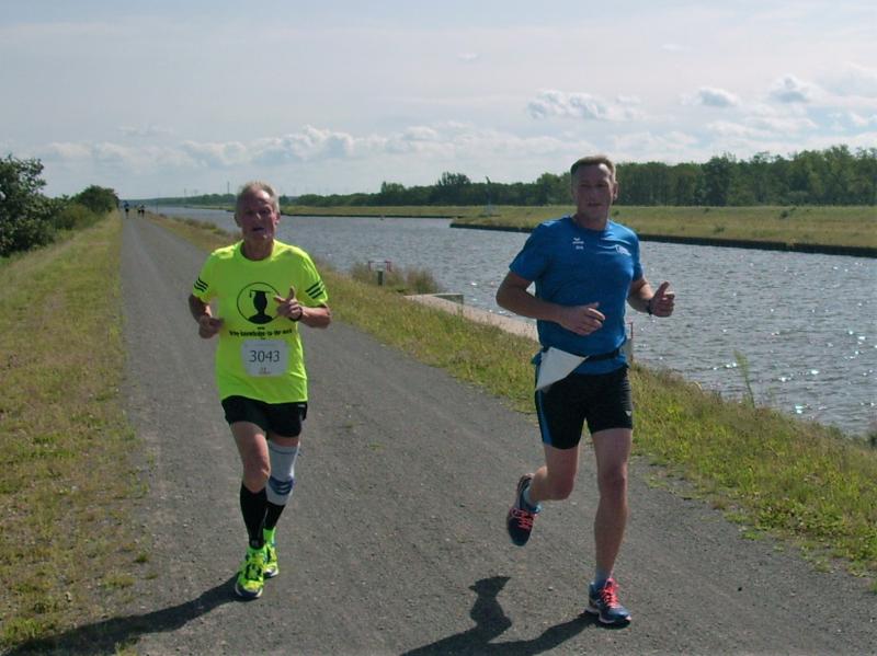 Es war gutes Laufwetter, nur die letzten zwölf Kilometer, insbesondere die am Kanal entlang, blies der Wind sehr stark von vorn, was für alle Läufer sehr anstrengend und nicht ideal war. Die vielen Fahrradbegleiter, die für die Sicherheit und Gesundheit der Läufer verantwortlich waren, hatten ebenfalls mit dem starken Gegenwind zu tun. Im Ziel waren aber beide Läufer mit ihrer Zeit von 2:36:56 Stunden sehr zufrieden.