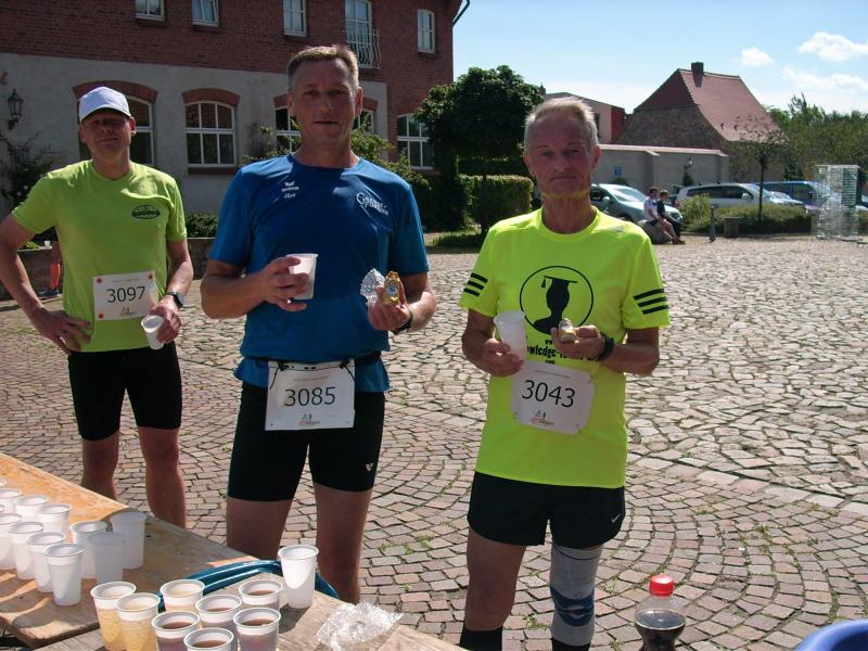 Werner Schwenke und Jörg Schäper von der Gaensefurther Sportbewegung liefen die Strecke gemeinsam in Fahrrad-Begleitung von Heidi Schwenke. Jörg Schäper trainiert für den Drei-Länder-Marathon am Bodensee im Oktober und Werner Schwenke für den Magdeburger Marathon. Beide liefen entspannt und unterhielten sich fast auf der gesamten Laufstrecke und außerdem alle fünf Kilometer an den Getränkestützpunkten mit den anderen Läufern und Getränkeausgebern.