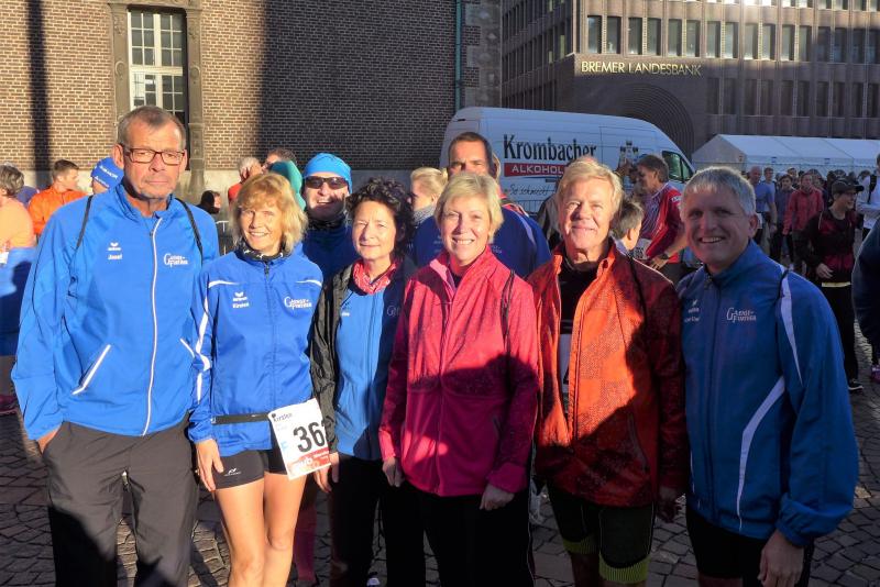 Mitten auf dem Marktplatz, zwischen Dom, Stadtmusikanten und dem Bremer Roland, erfolgte dann der Start über die Marathondistanz. Die Bode-Runners der Gaensefurther Sportbewegung hatten mit Kirsten Geist nur eine Teilnehmerin über die Königsdisziplin am Start. Mit allen guten Wünschen der Vereinskollegen machte sie sich zusammen mit 900 weiteren Startern auf den 42,195 Kilometer langen Weg. Es sollte nicht viel Zeit vergehen, dann wurden auch die Zehn-Kilometer-Läufer auf die Reise geschickt. Bei immer noch kühlen Temperaturen aber herrlichem Sonnenschein, finishte Christa Fümel aus Egeln ihren Lauf in neuer persönlicher Bestzeit. Noch deutlich unter einer Stunde, war sie außer sich vor Freude. Diese Euphorie nahmen die noch wartenden Gaensefurther gerne mit auf ihre Halbmarathondistanz. Die fast 3.500 Teilnehmer sollten an diesem Sonntag die letzte und größte Startgruppe sein und am Ende mit den meisten Marathonstartern im Ziel ankommen. Auf der gesamten Strecke durch die City feierten die Bremer begeistert ihre 14. Auflage des immer beliebter werdenden Stadtlaufes. Während die Teilnehmer auf der langen Distanz neben dem Rhododendron- und Bürgerpark auch den Badestrand am Werdersee und das Weserwehr zu Gesicht bekamen, begnügte sich der „Halbe“ mit der Überseestadt, der „Schlachte“ des einstigen Hafens und führte an der berühmten Böttchergasse und dem Schnoor Viertel mit seinen urigen Kneipen und Häuserzeilen vorbei. Direkt an der Weser entlang, kam das gigantische Stadion des viermaligen Deutschen Fußballmeisters dann endlich immer näher. Der Stadionsprecher hatte bei den vielen Teilnehmern seine Mühe, jeden Durchläufer namentlich zu erwähnen. Nach einer halben Stadionrunde war das Spektakel dann auch schon vorbei und nach einem kleinen Anstieg hinauf auf den Osterdeich, führten die letzten drei Kilometer durch die Stadt dann Richtung Ziel. Gruppen wie „Lustvolllaufenlernen“, die Renn-Enten, das Team Eggi, Laufrausch oder die Turnerschaft Harburg, alle hatten sich auf diesen Moment vorbereitet, alle wurden euphorisch auf dem Marktplatz empfangen und so für das lange Training belohnt. Auch bei den Gaensefurthern hagelte es Bestzeiten, denn neben André Geist, der noch nie so schnell auf der Halbmarathondistanz war, konnte auch Ehefrau Kirsten ihre bisherigen Marathonzeiten toppen. Im Hause Fümel werden sicher die Sektkorken geflogen sein, denn auch Harald konnte an seinem Ziel, unter zwei Stunden zu bleiben, endlich ein Häkchen setzen.