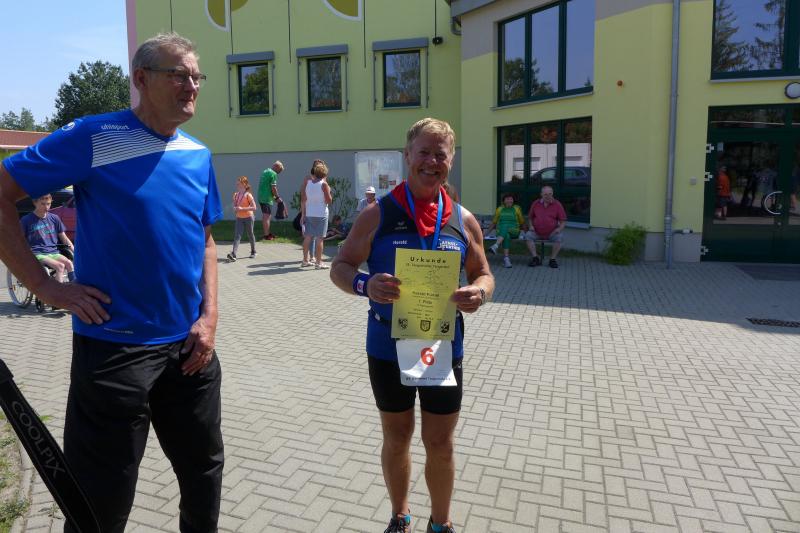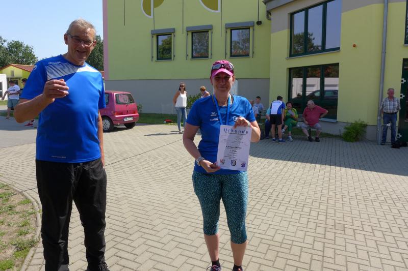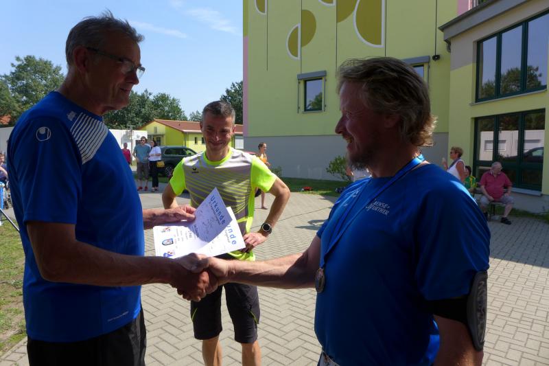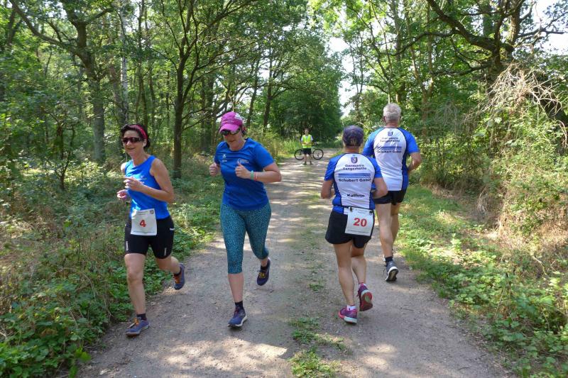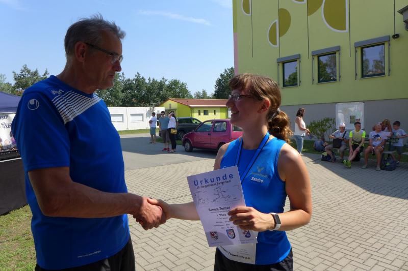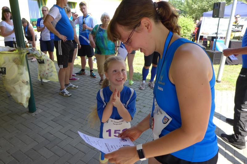 Während Kathleen Mahler und Börners nach dem Salzlandsparkassen-Triathlon vom Vortag nur auslaufen wollten, versprach Harald Fümel seiner Ehefrau Christa ein gemeinsames, ruhiges Sonntagsläufchen. Also ging der Auftrag, ein schnelles Rennen für die Bode-Runners abzuliefern, an Sandra Zelmer. Nach dem Radweg bis Briest führte die Laufstrecke durch den Tangerhütter Wald, in dem die Temperaturen etwas angenehmer waren. Die zusätzlichen Wasserstellen wurden gut angenommen und am Verpflegungspunkt der Tangerbrücke war dann auch schon die Wendemarke für den 6,5-Kilometer-Kurs erreicht. Zelmer musste noch weiter, bis ein Streckenposten den Wendepunkt der Neun-Kilometer-Strecke markierte. Die Sportlerin setzte den Auftrag sehr engagiert um und holte sich nach dem Zieldurchlauf prompt den Gesamtsieg bei den Frauen. Zeitgleich und eigentlich viel schneller als geplant, liefen Mahler und Börner auf Gesamtplatz 2 der Frauen ein. Während anlässlich der Jubiläumsausgabe noch einige Präsente an verdiente Sportfreunde des Tangerlaufs gingen, feierte auf Grund der geringen Teilnehmerzahl fast jeder Finisher einen Podestplatz. „Von wegen Auslaufen!“, scherzten und freuten sich die Sportfreunde unter der wohltuenden Dusche über ihre Platzierungen.