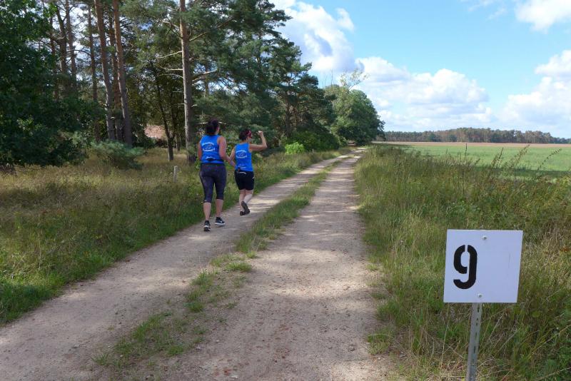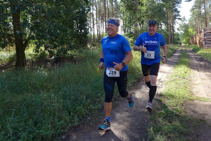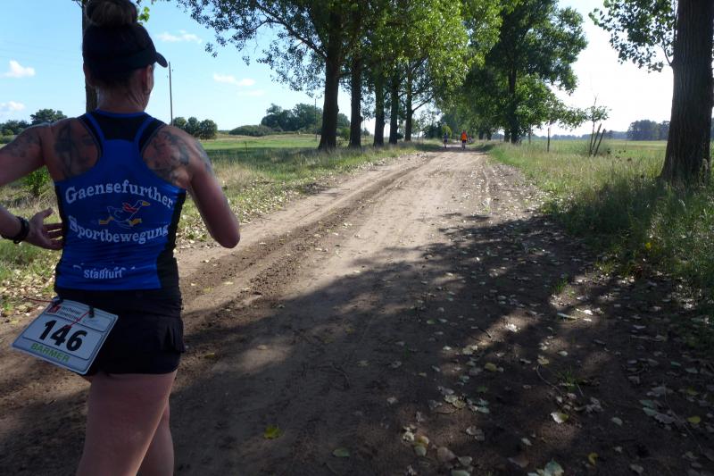 Neu im Programm war ein Halbmarathon über zwei Elf-Kilometer-Runden, welcher mit Bode-Runner Dirk Meier als erster Start auf die Strecke geschickt wurde. Bevor die Sechs- und Elf-Kilometer-Läufer dann los durften, erfolgten die Zieleinläufe der Kurzstrecken über 600 Meter und drei Kilometer. Damit waren ausreichend Hände vorhanden, die dem Läufernachwuchs einen begeisterten Empfang bereiteten. Warm geklatscht und mit gehörig Adrenalin im Blut, gehörte die Streckenführung nun ganz und gar der Mitteldistanz. Das Dreikilometerschild war gerade passiert, als die schnellsten Halbmarathonis in ihrer zweiten Runde nun die Läuferschar der Mitteldistanz überholten. Im Führungstrio lief Meier stark und nahm die antreibenden Wünsche seiner Lauffreunde für die letzten neun Kilometer gerne mit. Am Getränkestand trennten sich dann die Sechser- und die Elfer-Strecken. Stefan Sindermann freute sich über mehr Platz und setzte zu einem langen Endspurt an, was ihn in seiner Altersklasse M45 prompt auf den zweiten Platz katapultierte. Die Sportler bewegten sich durch so klangvolle Namen wie Hüttermühle, Alte Burg oder Wiechenberg und nicht weit entfernt wäre man in Mützel gelandet. Am letzten Getränkestand misslang mal wieder der Bechereinwurf. Schnell gebückt und wieder Fahrt aufnehmen, bevor die Verfolger von hinten zu nahe kommen! Vorbei an dichten Kiefernwäldern und frisch geschlagenem Holz, war bald wieder die Ortslage Parchen erreicht. Falk Heidel begleitete die ankommenden Läufer mit passenden Kommentaren in das Ziel, wo auch gleich Obst und Getränke gereicht wurden.