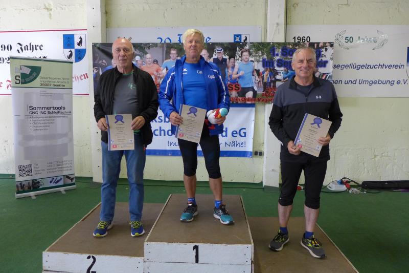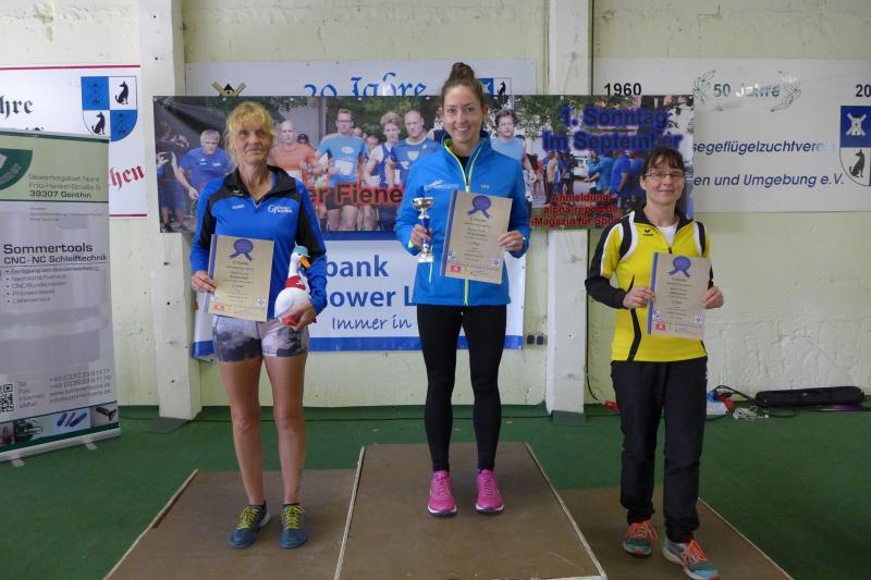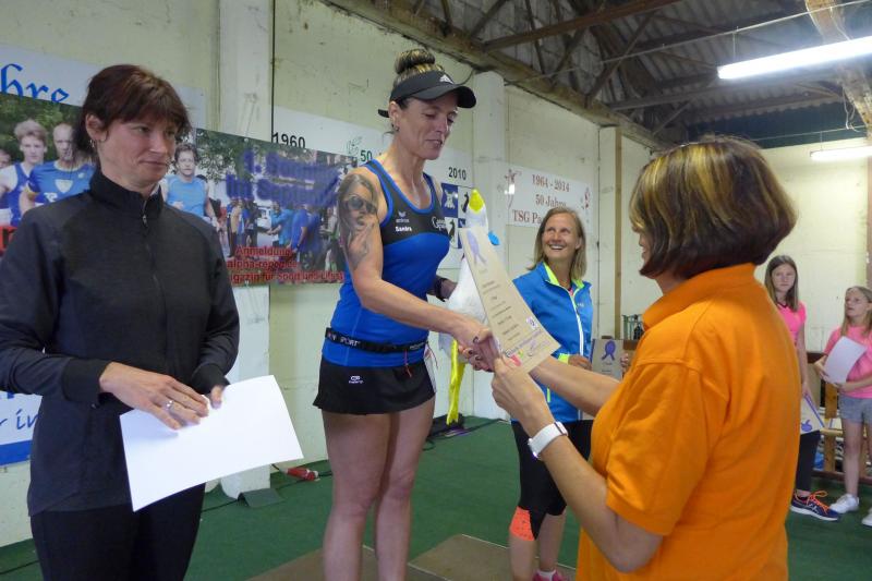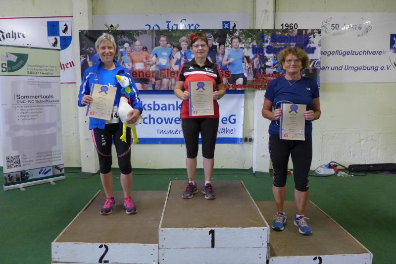 Heidel wechselte zur Siegerehrung in die Klapperhalle und an den großen Tischen fanden die vielen Sportgruppen ausreichend Platz für ihre vereinsinternen Auswertungen. Die weitgereisten Gaensefurther spekulierten sogar auf den großen Mannschaftspokal. Meier konnte seinen dritten Platz in der Gesamtwertung des Halbmarathons über die Ziellinie bringen und wurde auch für den zweiten Platz in seiner Altersklasse geehrt. Eine Aufregung dann, als der Name Fümel fiel: „Christa du musst auf die Bühne, du hast den dritten Platz!“, wurden der in der Altersklasse W65 startenden Sportlerin die Sporen gegeben. Verdutzt, als Platz zwei und eins dann von Männern besetzt wurden – da stimmt doch was nicht! Nein, nicht Fümel war aufgerufen, Kühnel vom SV Angern musste auf die Bühne und dann passte auch wieder das Männer-Podest. Mit eingezogenen Kopf reihte sich die Verdutzte wieder in ihrer Riege ein. Als dann wieder so ein ähnlicher Name fiel, fragte Fümel noch einmal nach, bevor sie ein zweites Mal das Podest bestieg. „Hey, du hast dich um einen Platz verbessert!“, foppten die Lauffreunde und ließen Fümel für ihren zweiten Platz hochleben. Richtig ab ging es am Tisch, als Ehemann Harald auf die Bühne beordert wurde. Als Sieger seiner Altersklasse M65 über 11,5 Kilometer war der Jubel nicht mehr zu bremsen. Mit der Mannschaftswertung kam dann die Ernüchterung zurück, denn die Bode-Runners hatten die Rechnung ohne die heimstarken Vereine gemacht. Durch die Vielzahl von jungen Startern auf den Kurzstrecken, waren die Gaensefurther chancenlos und traten mit einem guten sechsten Platz von insgesamt 27 Teams zufrieden die Heimreise an.