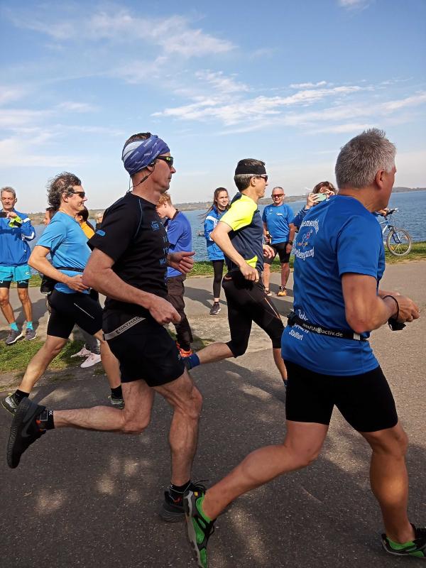 Erstaunlich ruhig und bei bestem Laufwetter präsentierte sich der Geiseltalsee am Feiertag der Deutschen Einheit. Da waren die Bode-Runners der Gaensefurther Sportbewegung in den zurückliegenden Jahren schon ganz anderen Wetterkapriolen ausgesetzt. Erste Aktion war also ein Gruppenfoto vor der beeindruckenden Kulisse. Kaum vorstellbar, das noch bis in das Jahr 2010 eine 16 Kilometer lange Pipeline den Geiseltalsee mit Saalewasser flutete. Als Veranstalter hatte der SV Braunsbedra das Hygienekonzept fest im Griff und konzentrierte sein Augenmerk auf die Durchführung der drei Hauptstrecken über 6,5 Kilometer, elf und 21,1 Kilometer.