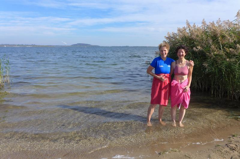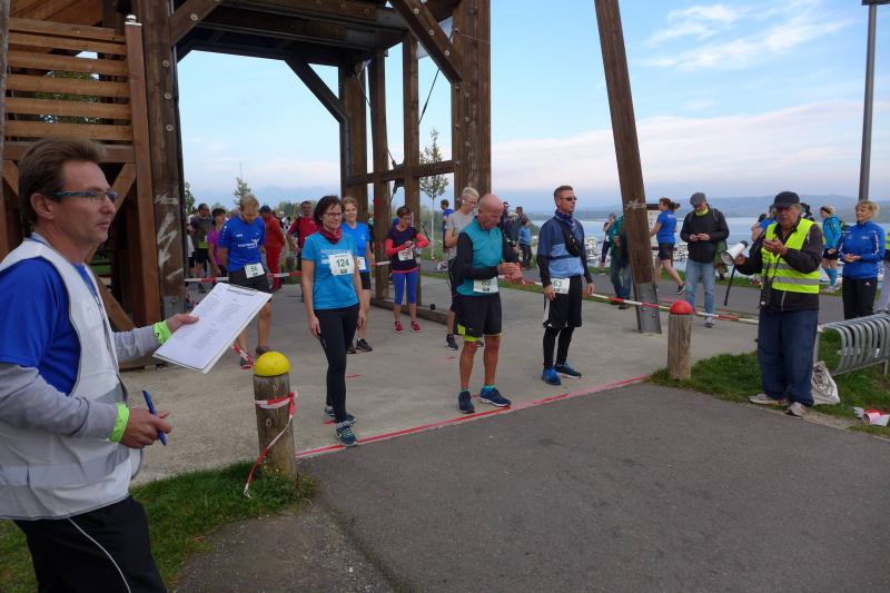 Genau 100 Teilnehmer nahmen im Anschluss die Distanz über elf Kilometer in Angriff. Da war "Angriff" wohl auch die richtige Umschreibung, denn bei Kilometer zwei verließen die Läufer den Rundweg und quälten sich eine 1,5 Kilometer lange Steigung nach oben. Die Belohnung ließ nicht lange auf sich warten, denn zum Glück ging es nach einer Schleife dort auch wieder hinunter. Die Streckenführung folgte jetzt der Kurzdistanz und vom südlichsten Punkt des Geiseltalsees gelang nun immer wieder der Blick auf die fast 200 Meter lange Seebrücke. Edgar Schmidtke, der sich noch auf den Berg gefreut hatte, beendete diesmal ohne Umwege seinen Wettkampf und war der schnellste Bode-Runner (2. Platz Altersklasse M55). Nur 80 Sekunden später überquerte Kirsten Geist (Altersklasse W55) als Gesamtsiegerin der Frauen die Ziellinie. Eine erstaunliche Laufleistung und über zwölf Minuten Abstand, ehe sich die Altersklassenkonkurrenz auf den weiteren Plätzen anschloss.