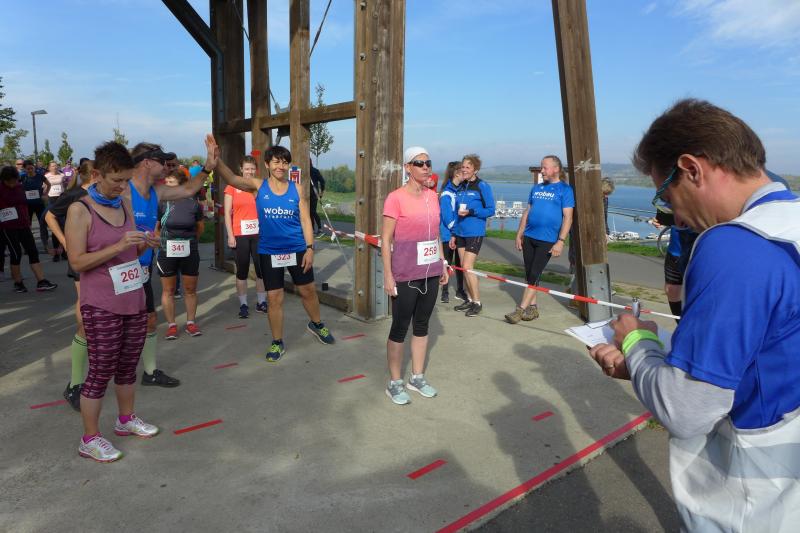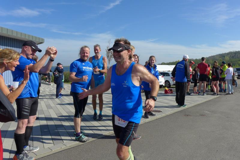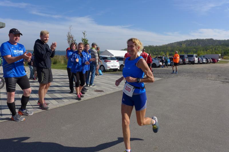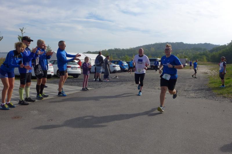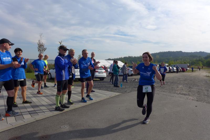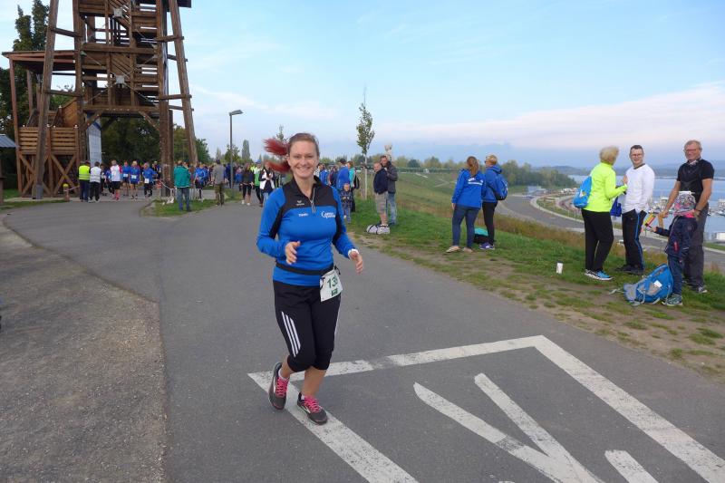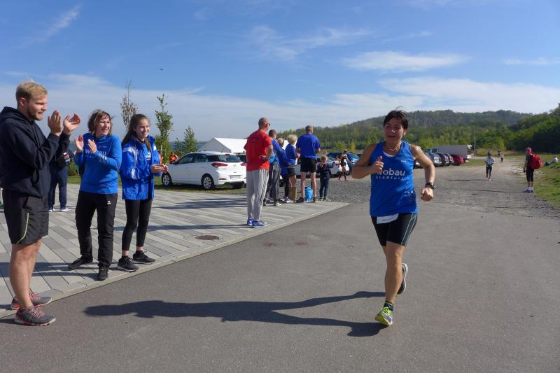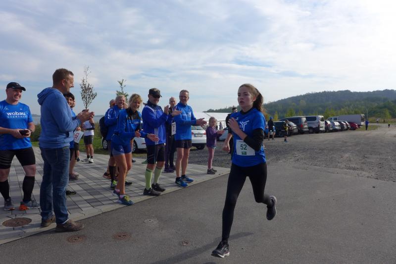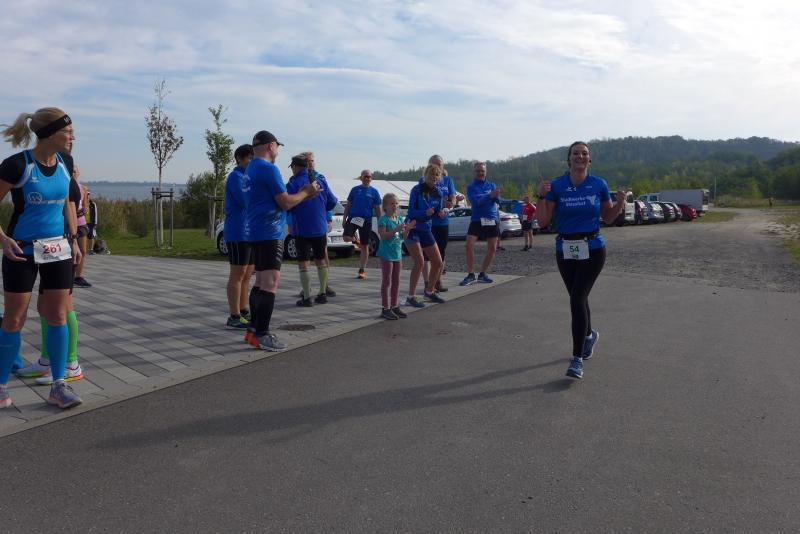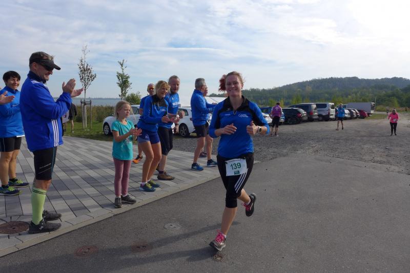 Vom Aussichtsturm „Leonhardt“ gingen jeweils zehn Starter im Minutentakt auf die Reise. Elf Gaensefurther waren auf der Kurzstrecke mit dabei. Da hatten es die Fahrgäste im Geiseltal-Express doch etwas bequemer. Unbeeindruckt und manchmal gefährlich nahe, zog die bunte Kleinwegebahn an den Läufern vorbei. In leichten Wellen ging es auf dem Geiseltalrundweg entlang, bevor die letzten drei Kilometer direkt am See zurückführten. Nach dem großen Zielbogen am Besucherzentrum Marina wurden alle Finisher herzlich begrüßt. Zehn Sekunden schneller als im vorigen Jahr, fuhr Sandra Homann (1. Platz Altersklasse W40) im vereinsinternen Duell den Sieg für sich ein, gefolgt von Jana Berger (1. Platz W50) und Janine Wuwer (3. Platz W35).