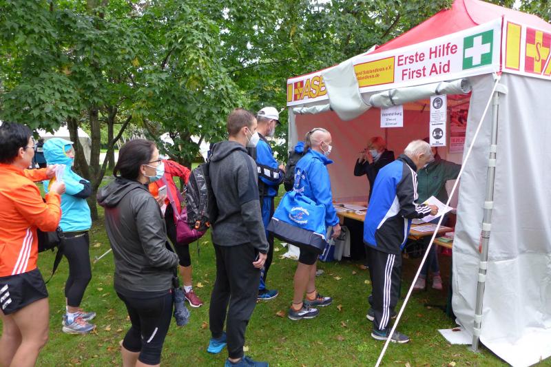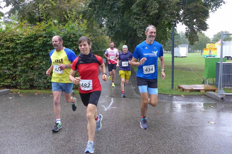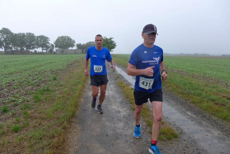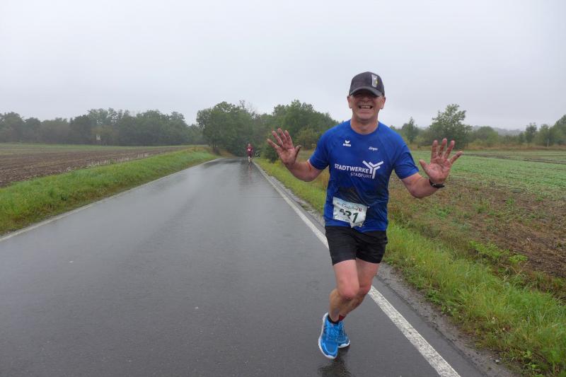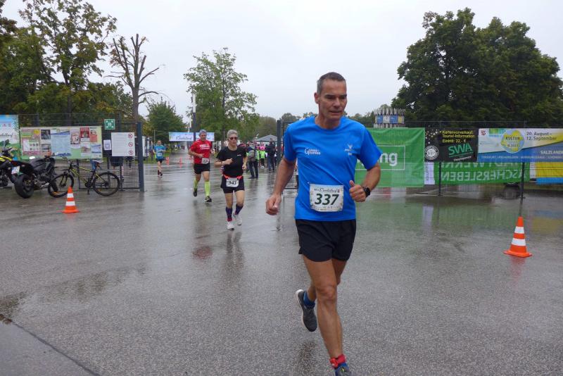 Die LSG Ascania schaffte mit ihrem neuen Start- und Zielbereich an der Herrenbreite eine besondere Atmosphäre zur 40. Jubiläumsauflage und bei der Größe der Parkanlage, war das pandemiebedingte Abstandhalten auch kein Problem. Nur den anhaltenden Regen hätten sich eine Woche zuvor wohl eher die Veranstalter der Genthiner Matschwolke gewünscht. Aber bekanntlich kommen ja nur die Harten in den Garten und so pfiff Paparazzi Börner seine Bodis im feinsten Nieselregen zur Fotoaufstellung vor dem Startbogen zusammen. „Leute, die Matten sind scharf!“, hallte es aus dem Messwagen der Zeiterfassung. Wie ein aufgescheuchter Hühnerhaufen sortierten sich die Lauffreunde entfernt der verlegten Messschleife neu, denn ein Kontakt hätte die Ergebnislisten der bereits gestarteten Walker arg durcheinander bringen können. Schnell noch ein Geburtstagsständchen für den Jürgen, der sich sehr über die vorgezogenen Starts und die damit näher rückende Kaffeerunde freute. Nahe am Ehekrach schrammte ein Bode-Runner-Pärchen vorbei, die es gerade noch schafften ihre Startunterlagen abzuholen: „Du musst auf die Laufstrecke!“, schickte sie den Gatten los, der nun zwölf Kilometer vor sich hatte, um das angestaute Adrenalin abzulaufen. Bei all der Aufregung geriet fast der Start von Debütantin Anke Delius ins Hintertreffen. Wie ein Routinier reihte sie sich aber in die lange Startaufstellung ein und zog ihre sieben Kilometer ruhig und ohne Gehpausen durch. Das kontinuierliche Training mit der Laufgruppe zeigte erste Erfolge und Delius lief nicht ohne Stolz über die Ziellinie. Nach langer Verletzungspause und mit etlichen Gehpausen über diese Distanz, war Sabine Börner wieder mit von der Partie. Einzig allein der dadurch errungene Mannschaftspunkt war das Ziel. Doch das gute Mannschaftsgefühl und die Tatsache, dass es langsam wieder aufwärts geht, waren allemal Lohn für die Quälerei. In Bestform und als schnellste Gaensefurtherin auf der Sieben-Kilometer-Distanz unterwegs, spulte Janine Wuwer ihr Rennen ab. „Das ist mein Wetter!“, freute sich die Sportlerin dann auch noch über ihren ersten Platz in der Altersklasse W40. Als „langer Kanten“ musste beim Jubiläumslauf die 18,5 Kilometer lange Strecke reichen. Führte 2019 der 25-Kilometer-Kurs noch über die Burg Arnstein, ging es diesmal schon kurz vor Welbsleben zurück, oft am Flüsschen Eine entlang, direkt wieder in das Zentrum von Aschersleben. Okay, die Strecke war kürzer aber dennoch sehr anspruchsvoll. So berichteten einige Finisher, dass sie auf Grund der Nässe die Wegmarkierungen nicht erkannten und dadurch einige Kilometer mehr zusammen kamen. Die aufgeweichten Sommerwege sorgten indes für abenteuerliche Rutschpassagen. Umso intensiver waren die Erfolgserlebnisse und die Streckenberichte dann im Ziel.