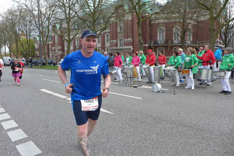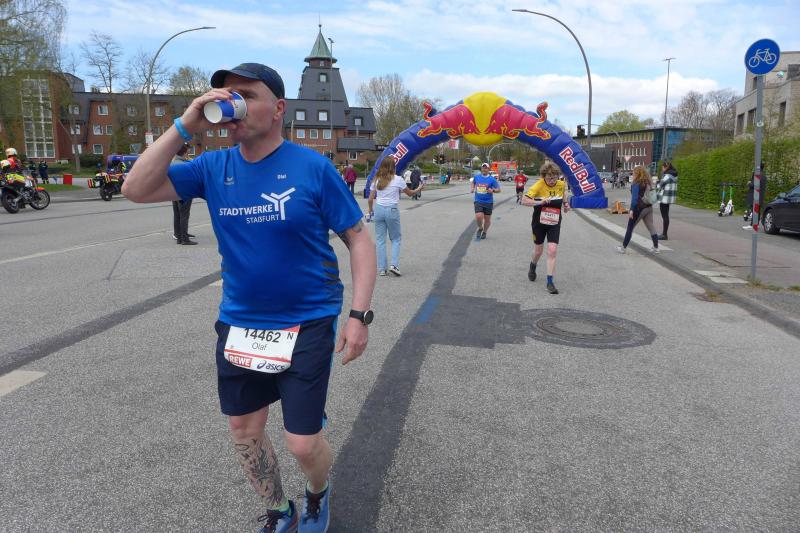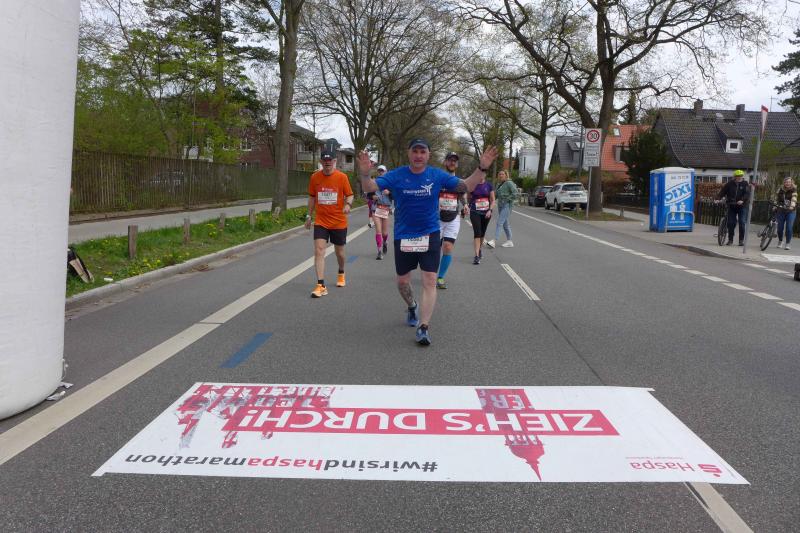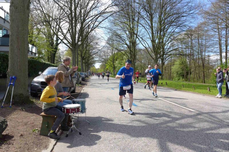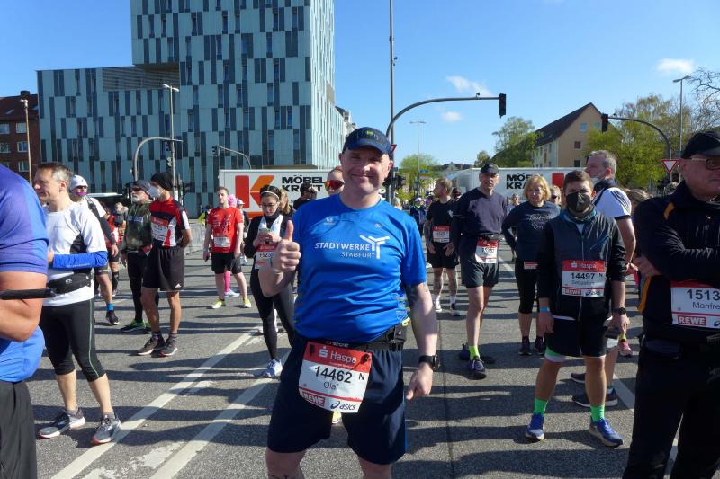 Nach coronabedingter Zwangspause im vorigen Jahr, war der Startplatz für Bothe in 2022 quasi reserviert. Da mussten die aktuellen Wettkämpfe erstmal mit dem Trainingsplan abgestimmt werden. Doch der Halbmarathon in Berlin und ein abschließender 30 Kilometer-Lauf auf heimatlichen Wegen, waren dann Vorbereitung genug. "Bist du aufgeregt?", fragte der mitgereiste Fanclub nach dem Einchecken im Hotel? "Nicht die Bohne", lauschte Bothe in sich hinein. Spätestens als er dann die Startnummer in den Händen hielt, stieg die Anspannung auch bei dem Debütanten. Über die Streckenlänge von 42,195 Kilometer ist Bothe noch nie am Stück gelaufen. Durchhalten und ankommen war das ausgemachte Ziel, eine Zeitvorgabe wollte Bothe sich nicht machen. Während dem Lauffreund frühzeitiges Zubettgehen ans Herz gelegt wurde, studierte Jens-Uwe Börner U-Bahn-, Zeit- und Streckenpläne entlang des Marathons. Mit einer Tageskarte der Bahn, ließ sich der zuschauerfreundliche Kurs mehrfach ansteuern. War das Läuferfeld erstmal unterwegs, hatte Börner insgesamt fünf Zwischenstationen ausgemacht, um Bothe an der Strecke abzupassen, ein Stück mitzulaufen und mit zunehmenden Kilometern natürlich zu motivieren. Und dann war Bothe endlich unterwegs. Die Tränen von Ehefrau Nancy trockneten andere Bode-Runners: "Er schafft das! Er ist gut trainiert und er hat Spaß auf der Strecke!", beruhigten die Lauffreunde, nachdem der Startschuss so viele Emotionen freigesetzt hatte. Wie vereinbart, verteilte sich die mitgereiste Fangemeinde an der 42 Kilometer langen Partyzone. Nachdem die Führungsfahrzeuge für die Profis auf der Strecke Platz gemacht hatten, folgte der nicht abreißende Strom der Volksläufer. Da brauchten auch die zahlreichen Zuschauer an der Strecke eine ordentliche Portion Ausdauer für ihr Motivationsprogramm. Bei den ersten beiden Anlaufpunkten hatte Börner Glück, denn Bothe war eigentlich zu schnell unterwegs und viel zu zeitig am anvisierten Streckenpunkt. Die Stimmung war einmalig: „Adrenalin ohne Ende!“, klatschte Bothe seinen Streckenmotivator ab und ließ sich vom Strom mitziehen. Reeperbahn und Elbchaussee lagen hinter ihm, als mit den Landungsbrücken ein weiteres Highlight anstand. Die Familie konnte das Oberhaupt in der Menge ausfindig machen und feierte ihn noch vor der imposanten Elbphilharmonie. Hafencity und Speicherstadt durften nicht fehlen, bevor Bothe von der Kennedybrücke den tollen Blick über die Binnenalster wahrnahm.