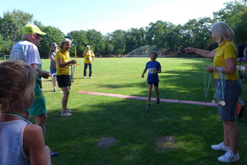 Der Schnupperlauf über einen Kilometer war für den Bode-Runners-Nachwuchs schnell Geschichte, so dass sich Lenya und Emily im Schatten oder unter dem Rasensprenger des SV Grün-Weiß Giersleben schnell wieder akklimatisieren konnten.
