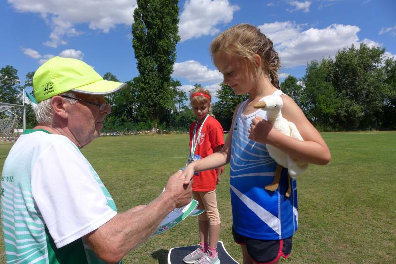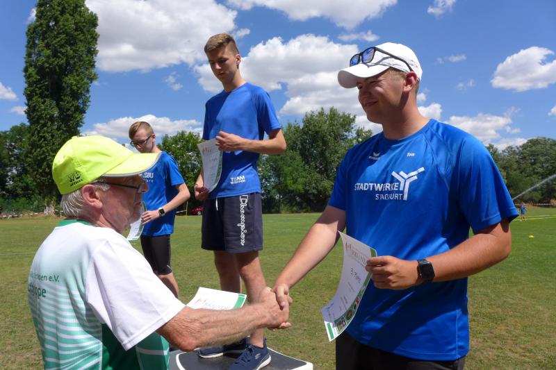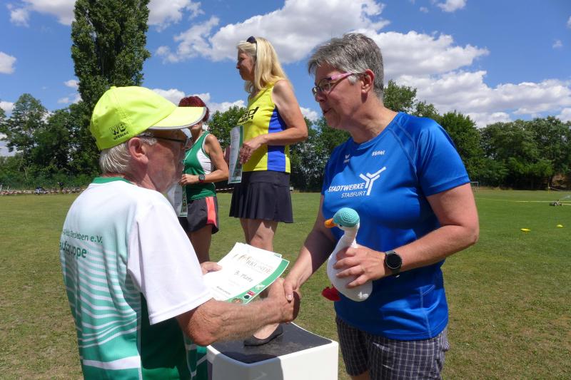 Noch einige Bode-Runners wurden in Giersleben auf das Treppchen gerufen. In sengender Mittagsglut wurde Peter Gieseler vom gastgebenden Verein nicht müde, allen Platzierten mit einem kräftigen Händedruck, einer Umarmung oder sogar mit Küsschen hier und Küsschen da zum erlaufenen Erfolg zu gratulieren. Man kennt sich eben, eine herzliche und ungezwungene Atmosphäre, zu der die Bode-Runners der Gaensefurther Sportbewegung im nächsten Jahr gerne wieder auflaufen.