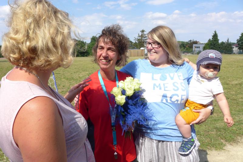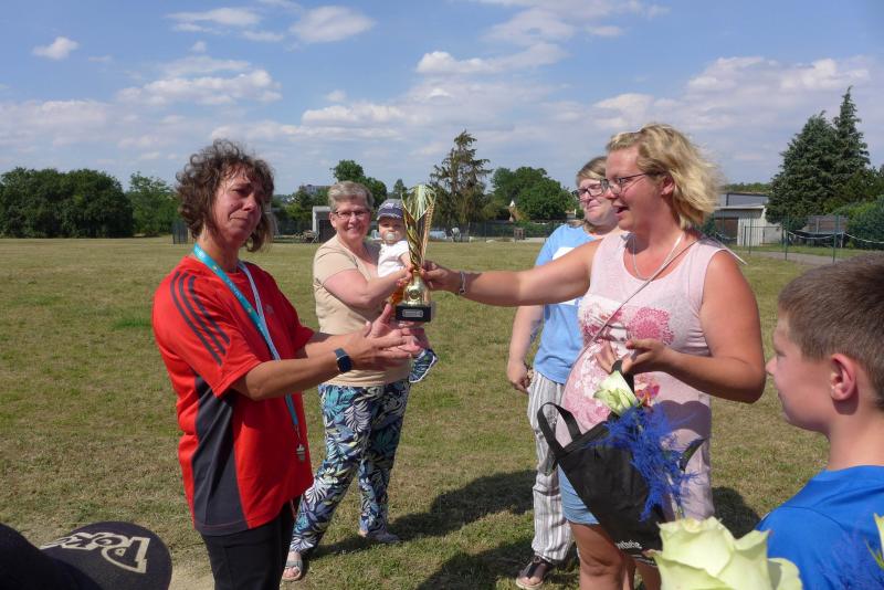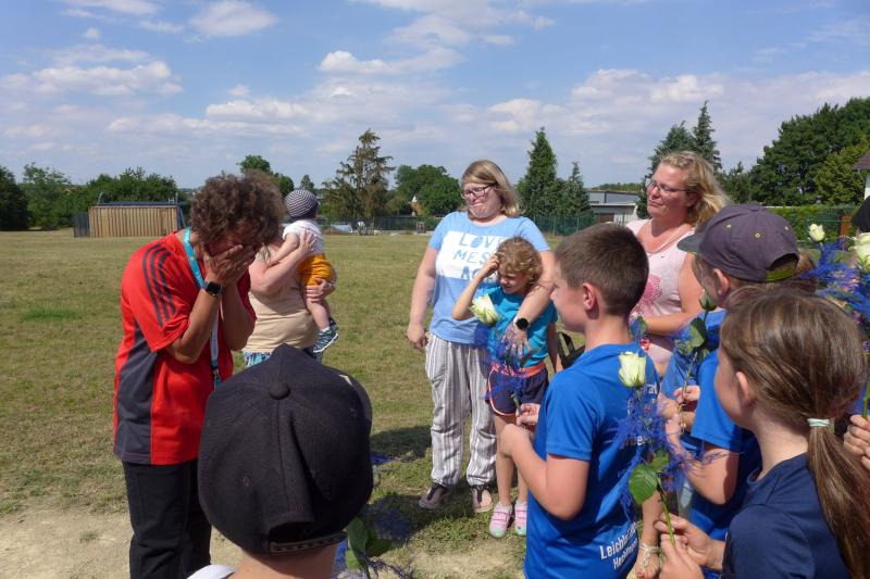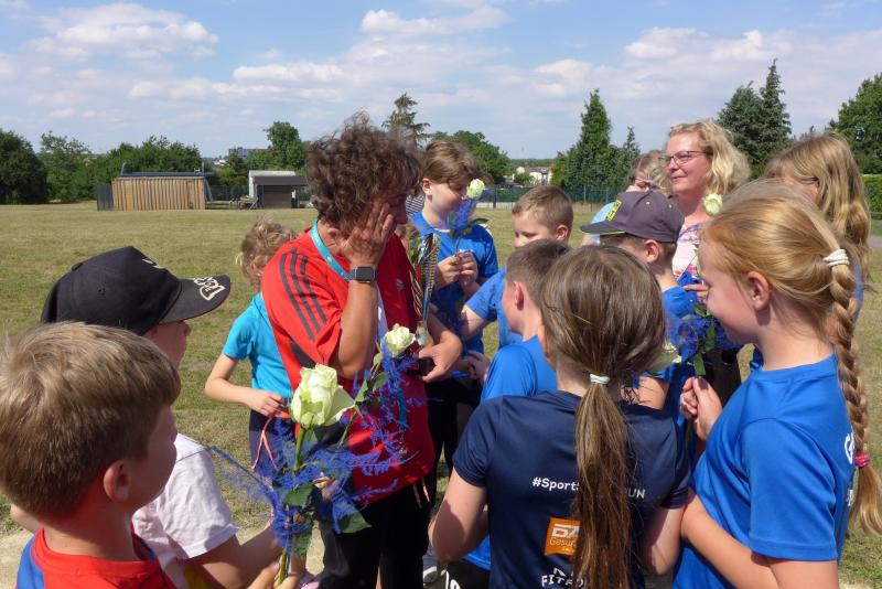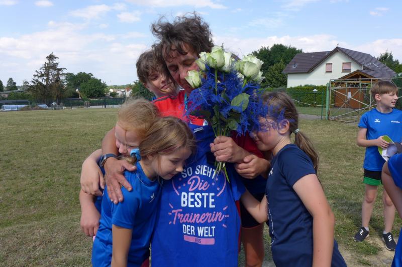 Einen tragischen Verlust muss indes die Kinder-Trainingsgruppe der Gaensefurther Sportbewegung verkraften. Mit den letzten Schultagen endete für die elf Kinder von sieben bis zehn Jahre das Training mit ihrer Silke. Der Umzug in eine andere Stadt ist leider nicht abzuwenden. Dabei hatte sie mit Überbringung dieser traurigen Tatsache wohl am meisten zu kämpfen. Als die Kinder und Eltern die langjährige Übungsleiterin zur letzten Trainingseinheit nun mit einer kleinen Abschiedsfeier überraschten, nahmen die Tränen ihren Lauf. Jedes Kind verabschiedete sich mit einer Rose, natürlich in den Gaensefurther Vereinsfarben blau/weiß. Ein Erinnerungs-T-Shirt für die beste Trainerin der Welt und ein Pokal durften natürlich nicht fehlen. Auch Vertreter der Laufgruppe überbrachten im Namen des Vorstandes ein kleines Dankeschön für die wichtige Arbeit mit den Kids. Silke Vorrath versteht es gut, das Einmaleins der Leichtathletik neigungs-, altersgerecht und spielerisch zu vermitteln. Mit den Sportanlagen rund um die Hecklinger Grundschule hat die temperamentvolle Kindergruppe auch alle Möglichkeiten für ein abwechslungsreiches Training. Doch wie kann es nun weitergehen? Diese Frage wüsste auch Vorrath allzu gerne beantwortet. Im Moment steht ein Übungsleiter-Papa in den Startlöchern, der erstmal alle 14 Tage das Dienstagstraining übernehmen wird. Freiwillige vor, die Gaensefurther Sportbewegung und allen voran die Kinder-Leichtathletikgruppe, sucht dringend nach ein, besser zwei tatkräftigen Unterstützern. Interessenten melden sich sehr gerne direkt bei der Kindergruppe, die immer dienstags ab 15:30 Uhr trainiert oder per E-Mail bei den Bode-Runners unter laufgruppe@gaensefurther-sportbewegung.de, damit ein kräftiges "Sport frei!" weiterhin für Begeisterung bei dem Sportlernachwuchs sorgt...
