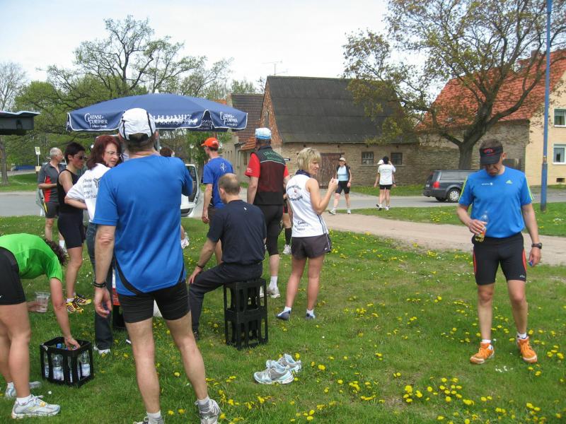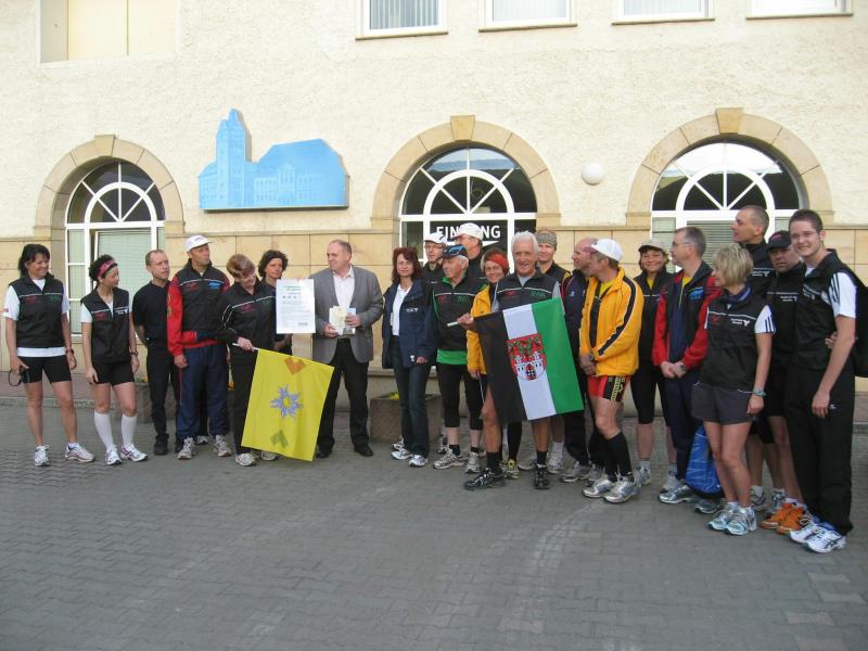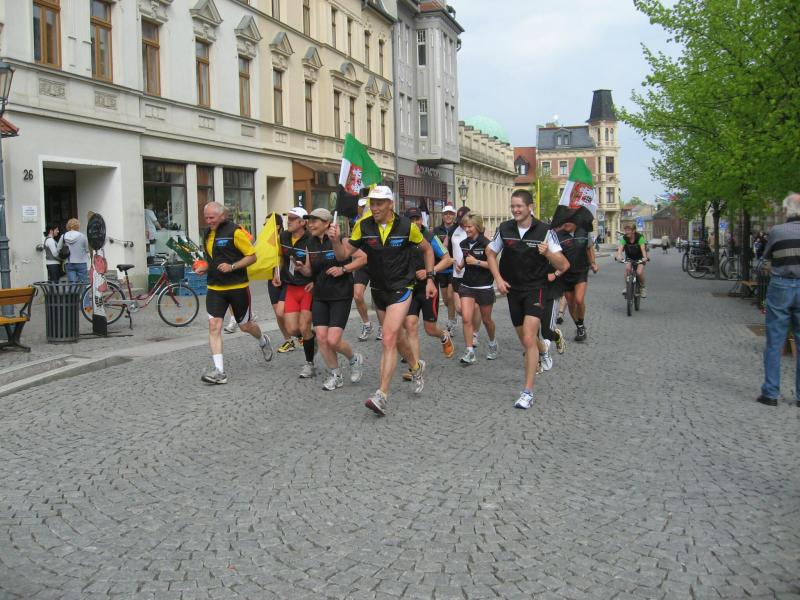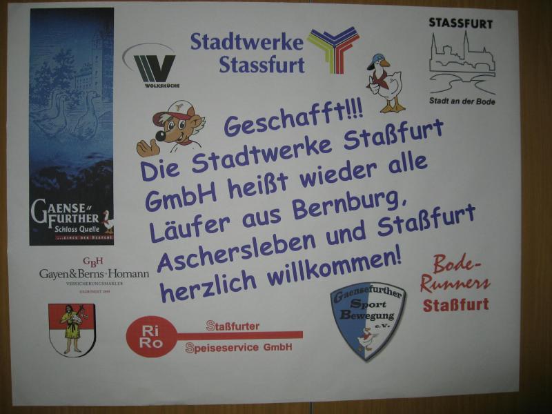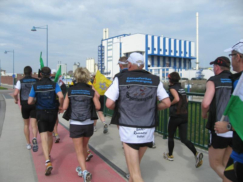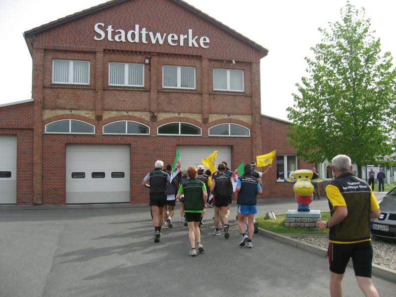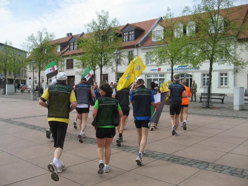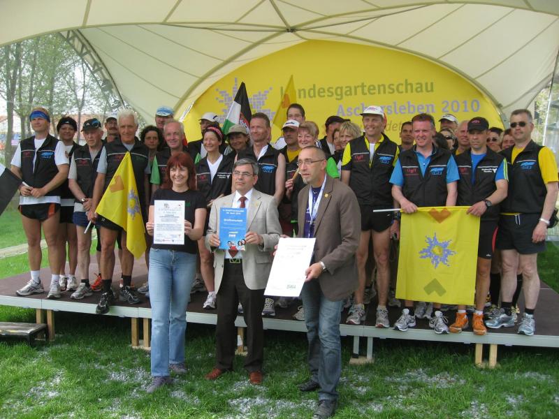 Nachdem sich zu früher Stunde bereits eine große Gruppe von Läufern der beteiligten Laufgruppen vor der Gaensefurther Schlossbrunnen Wüllner GmbH eingefunden hatte, verabschiedete deren Geschäftsführer Horst Braunisch die Teilnehmer, nicht aber ohne ihnen einen PKW voll mit erfrischendem Naß mit auf die Reise zu geben. Über die Roßbahn ging es dann zur 1. Etappe nach Staßfurt zu den Stadtwerken, wo die Läufer schon von OB René Zok und Betriebsangehörigen erwartet wurden. Die Übergabe der Staffelstäbe und die Einnahme einer kleinen Wegzehrung hingegen mussten zügig abgewickelt werden, hatte man doch durch einen Termin bei der LAGA in Aschersleben einen straffen Zeitplan vorgegeben. Wenn die Landesgartenschau für die älteste Stadt Sachsen-Anhalts das absolute Highlight des Jahres ist, warum nicht auch in den diesjährigen Stadtwerkelauf einbinden, dachten sich die Läufer von Ascania Aschersleben und sorgten damit für eine nette Bereicherung der Tagesplanes. Bei warmen, aber angenehmen Wind ging es weiter nach Bernburg, entlang der Bode und der Saale, deren Auen sich frühlingshaft geschmückt zeigten. Schon allein dieses Flair entschädigte für so manche Strapazen. In Bernburg bei den Stadtwerken angekommen, folgte dann der gewohnt herzliche Empfang mit Übergabe der Grußbotschaften, ergänzt durch einen leckeren Imbiß und weiter ging’s. An Verpflegung unterwegs mangelte es ebenfalls nicht. Die von Gaensefurther gesponserten Getränke und die Lunchpakete vom Speiseservice RiRo ließen diesbezüglich fast keinen Wunsch offen. Hatte trotz alledem ein Aktiver konditionelle Probleme, konnte er sich in einem der vier Begleitfahrzeuge erholen. 2 Sportler mussten leider ihren Plan, die gesamte Strecke durchzulaufen, nach 50 km aufgeben, denn das hohe Lauftempo forderte seinen Tribut. Bei dieser Eile übersah dann in den engen Promenaden von Aschersleben prompt ein Läufer einen Poller und es kam zu einer schmerzhaften Kollision. Aber zum Jammern blieb wenig Zeit, denn die Landesgartenschau wartete. Auf der Bühne im Weingarten war dann einige Prominenz versammelt und mittendrin unsere Helden mit den flinken Beinen, überwältigt vom folgenden Blitzlichtgewitter. Nachdem die eigentliche Mission des Laufes, die Übergabe einer Grußbotschaft auch an die Stadtwerke Aschersleben abgehandelt war, die die gute Zusammenarbeit auf kulturellem, wirtschaftlichen und natürlich sportlichem Gebiet dokumentieren soll, folgte die letzte Etappe der insgesamt 70 km langen Strecke.