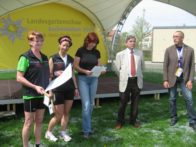 „Gartenschauen sind Akzeptanzkatalysatoren. Hier in Aschersleben natürlich für die Stadt, den gärtnerischen Berufsstand und die politische Ordnungseinheit des Salzlandkreises. Und genau an dieser Nahlinie kommen Gartenschau und STADTwerkeLAUF zusammen. Beide werben eigentlich für die gleiche Sache“, so Jürgen Herzog, „grüner“ Geschäftsführer der Landesgartenschau Aschersleben 2010 GmbH auf der Bühne bei der Verkündung der Botschaft. Peter Heister, der Geschäftsführer der Stadtwerke Aschersleben, einer der Hauptsponsoren des STADTwerkeLAUFs, sieht das ähnlich. „Wir sind gern dabei, wenn es um eine gute Sache geht und Menschen für etwas begeistert werden können.“