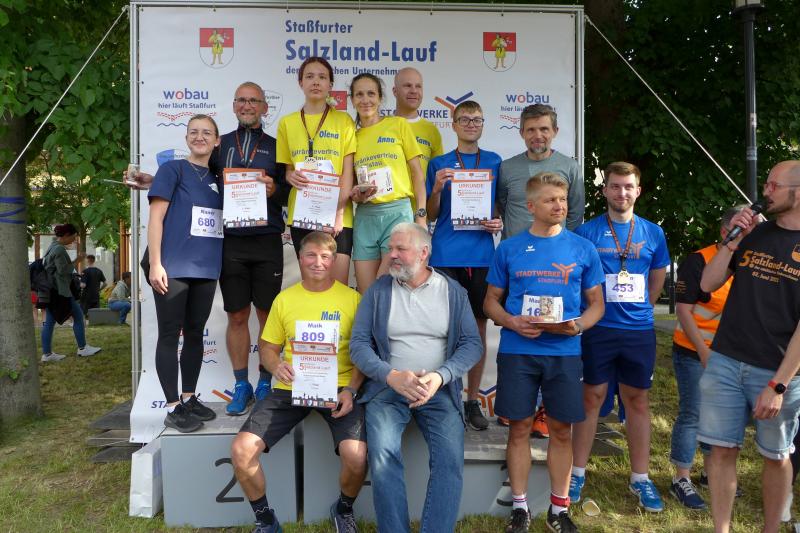 Auch Geschäftsführer Eugen Keller ging mit den „flotten Stadtwerkern“ an den Start. Zusammen belegten sie den dritten Platz der Firmenwertung. Rang zwei ging an Ciech Soda, die mit 13 Teilnehmern das größte Starterfeld ins Rennen schickten. Mit dabei waren unter anderem Tischtennisspieler Maik Amme oder die Fußballer Marcel Maier und Felix Jesse. Nicht zu schlagen war aber der Getränkevertrieb Ristau, der mit 40 Sekunden Vorsprung die Firmenwertung gewann.