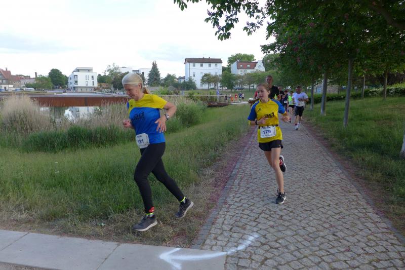 Zum Abschluss ab 18.45 Uhr gingen schließlich die Starter der beiden Hauptläufe über sechs und zehn Kilometer auf die Strecke – und zwar gemein sam. Nach gut 20 Minuten standen die ersten Punktesammler für den Solvay- und Landescup fest. Leif Fricke (LAV Halensia) sicherte sich in 20:55,7 Minuten den Sieg auf der „Kurzstrecke“. Schnellste Frau war Viktoriia Kolchyk aus dem ukrainischen Lemberg.