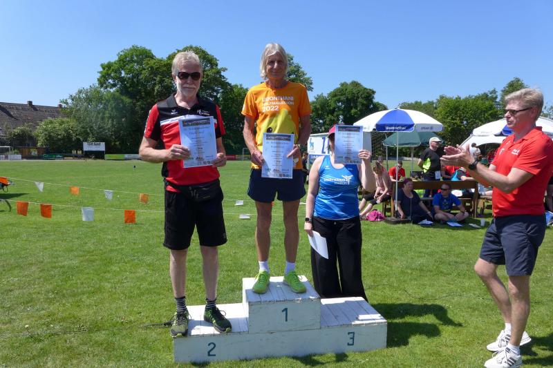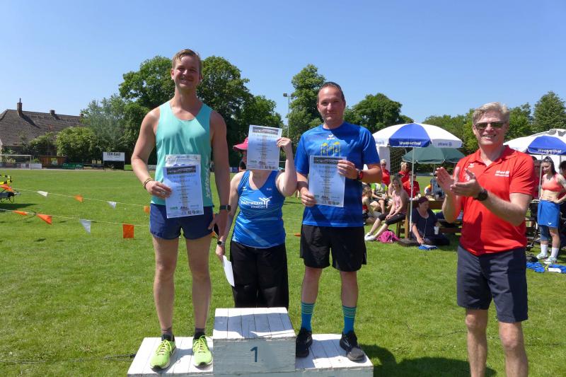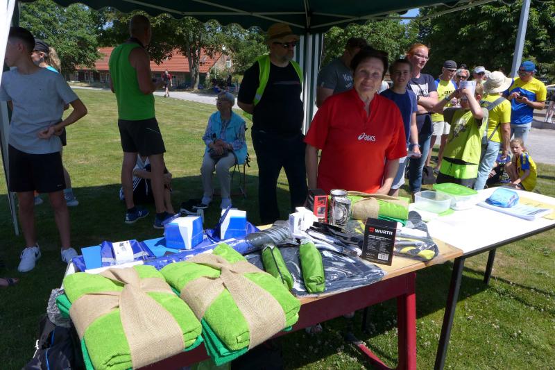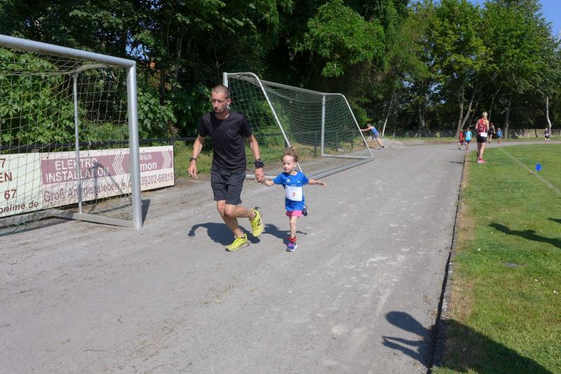 Die Startlinie auf dem Sportplatz füllte sich erneut, als dann die Wertungsläufe über sechs und zwölf Kilometer aufgerufen wurden. Vom weichen Sportplatzrasen ging es verwinkelt hinaus durch ein heißes Schackensleben, am stillgelegten Bahnhof vorbei in die weite Magdeburger Börde. Von wegen flach, der ersten Wasserstation ging eine Anhöhe voraus, die erst erlaufen werden musste. Frisch gestärkt ging es dann zunächst wieder hinab, bevor nach dem Stadiondurchlauf der Kurs erneut in Angriff genommen wurde. Hier kamen dem Gaensefurther Fotografen dann zum Glück noch einmal die Führungsläufer entgegen, die er diesmal beim Stadionstart verpasst hatte. Bis auf vier Bode-Runners, hatten alle anderen Lauffreunde auf Grund der Hitze oder aus taktischen Beweggründen in Sicht auf die Wertungspunkte, nur eine Runde durch die Börde absolviert. Jens Stampnik lief allen voraus, gefolgt von Sandra Homann und Neuzugang Jens Kunkel. So schnell unterwegs, wurden sie dann auch mit einem ersten Platz in ihren Altersklassen geehrt. Christa und Harald Fümel zogen die 6,3 Kilometer zusammen durch und liefen in ihren Einzelwertungen jeweils auf Platz drei. Ganz starke Damen waren in Schackensleben Kirsten Geist und Petra Becker, die sich an die zweite Runde trauten und am Ende mit Platz eins und drei für ihre Laufleistung belohnt wurden. Bis auf eine Ausnahme, hatten die Bode-Runners wieder einmal kein Losglück bei der abschließenden Tombola der Laufgruppe Hopfen Schackensleben. Nur Emily hatte an diesem Sonntag Fortuna auf ihrer Seite: „Ich habe die Startnummer 111!“, strahlte sie schon vor dem Start. Dann stand sie bei der Siegerehrung auf dem ersten Platz und gewann als einzige Gaensefurther Starterin ein hochwertiges Taschenmesser, über das sich der Papa am Ende freuen durfte. Eine Tüte Gummibärchen glich die Abgabe zum Glück wieder auf.