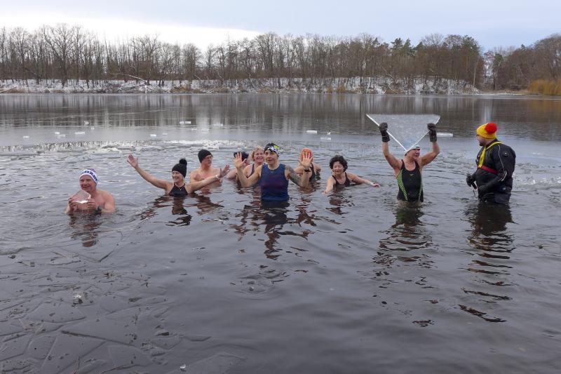 Das kalte Wetter hätte an diesem Tag nicht besser sein können, denn der See war in Ufernähe mit einer zwei Zentimeter dicken Eisschicht bedeckt. Ein Rettungsschwimmer, der in einem dicken Neoprenanzug steckte, hatte gut zu tun, für die Eisbader eine kleine Badestelle freizulegen. Inzwischen füllte sich das Gelände mit reichlich Zuschauern, zwischen denen wohl so einige Eisbader stecken mussten. Nach und nach outeten sich die Mutigen durch ihre lustigen Badetextilien, oder Badeschuhe, sogar Styroporplatten gegen die Bodenkälte kamen zum Einsatz. Jeder hatte seine eigene Taktik, sich auf die eisigen Sekunden oder Minütchen im kalten Eiswasser vorzubereiten. Nach einer kleinen Ansprache auch mit dem Appell es bitte nicht zu übertreiben, erfolgte eine Erwärmung bei flotter Musik. Oberstes Gebot beim Eisbaden ist nämlich, nicht kalt in das Wasser zu gehen.