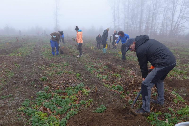 Im November war es dann soweit, die Geburtstags-Bäume sollten gesetzt werden! Über 70 Teilnehmer hatten sich zur Pflanzung von insgesamt 4.500 Bäumen im Südharz zusammengefunden. Unter ihnen auch neun Bode-Runners, die nicht laufend, sondern diesmal mit Spaten und vollem Körpereinsatz ihre Kraft und Ausdauer unter Beweis stellen wollten. Während die starken Männer die Pflanzlöcher in den feuchten Waldboden zauberten, sorgten die Mädels für die bunte Vielfalt und das fachgerechte Andrücken der Setzlinge. Zum Glück war Petrus einsichtig und hatte eine längere Regenpause angeordnet. Doch der kalte Nebel sorgte für eine frostige Umgebungstemperatur, so dass nur Arbeit im Akkord für eine angenehme Betriebstemperatur sorgte. Neben immergrünen Zedern als einziges Nadelgewächs, wurden Rotbuchen, Eichen, Ahorn, Haselnuss und Kastanien gesetzt. „So dicht?“, wunderten sich die Gärtner auf Zeit über die enge Anordnung auf dem großen, eingezäunten Areal. Nur die Stärksten werden es schaffen, wissen die anleitenden Experten und freuten sich über so viel Engagement ihrer Gäste und gaben auch sonst viel Wissenswertes über Wald, Klima und Borkenkäfer weiter. „100!“, schallte es nach einiger Zeit laut über das Gelände. Applaus und Jubel von den Anwesenden folgten prompt und ein Glücksgefühl, das nicht in Worte zu fassen war. Mitgezählt hatten die Bode-Runners nicht. Wichtig war, dass nach fünf Stunden alle 4.500 Bäumchen einen Platz gefunden hatten.
