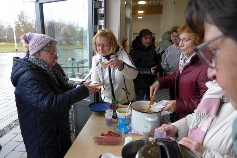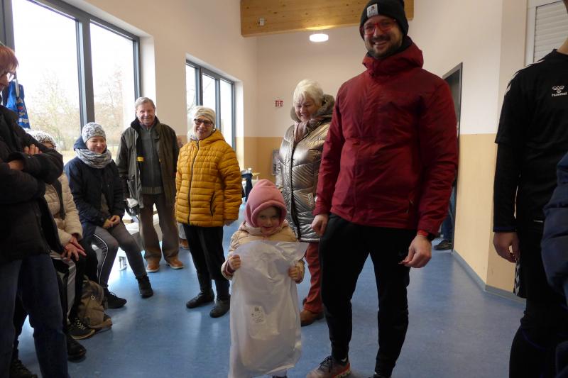 Im Start-Zielbereich bereiteten währenddessen die Frauen der Gymnastikgruppe Tee, Glühwein und Würstchen vor. Neben diesem Imbiss erhielten alle Teilnehmer des Laufes eine Marke an der sie bei der Verlosung der Karpfen teilnehmen konnten. Denn das Motto lautete: „Jeder, der läuft hat die Chance einen Karpfen zu gewinnen!“