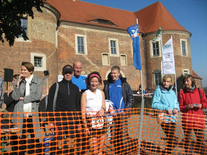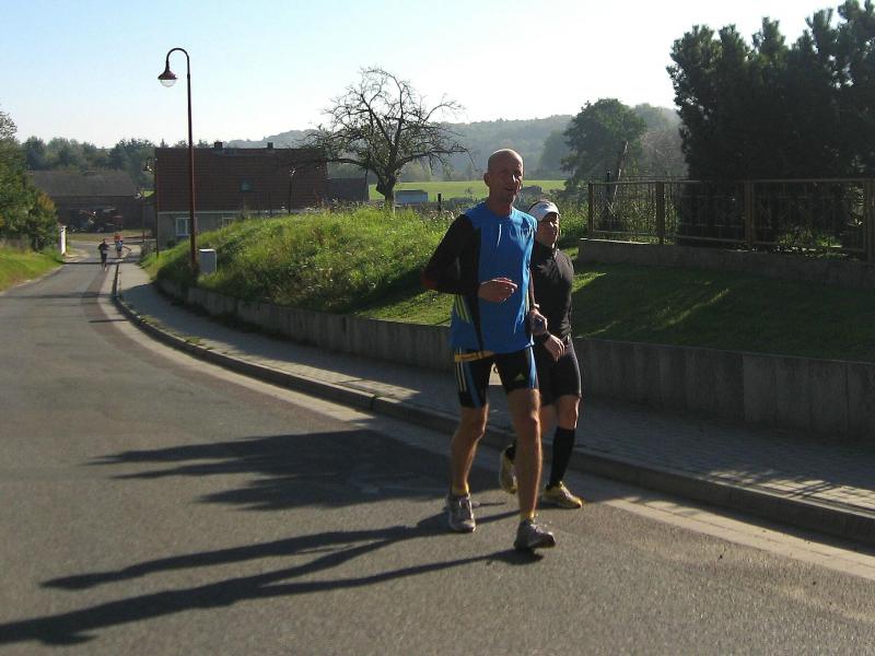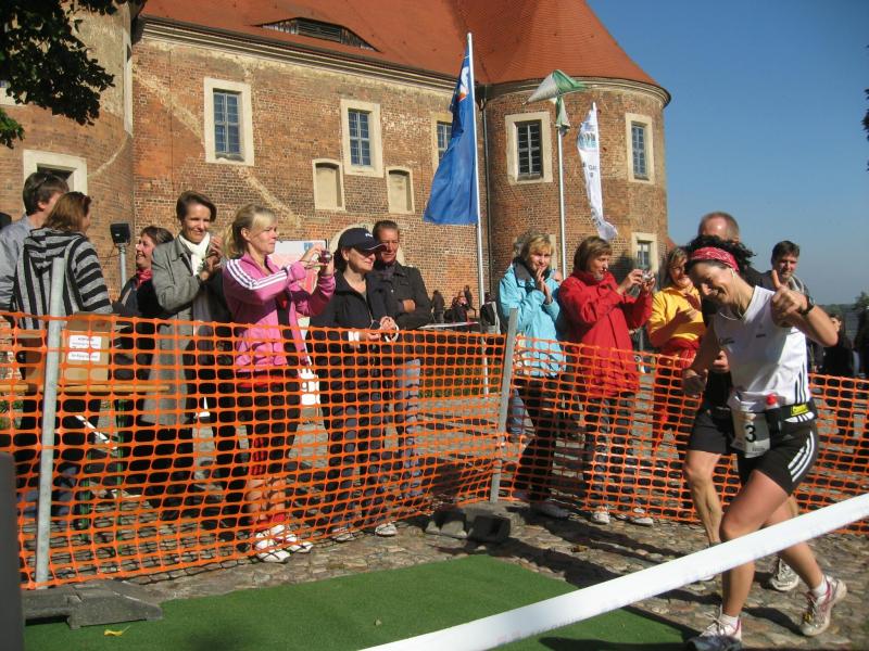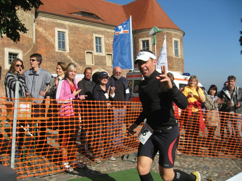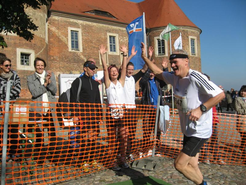 An diesem 10.10.2010 schien die Burg Eisenhardt in grelle Morgensonne getränkt, das Thermometer gab aber nicht mehr als 3° Celsius her. Kurze oder lange Laufsachen, das musste nun jeder Läufer für sich entscheiden. Satter, herbstlicher Wald und intensiver Pilz- und Nadelduft erwartete die Läufer zunächst, nachdem man Belzig hinter sich gelassen hatte. Zusammen mit der Kurzdistanz über acht Kilometer ging es für über 550 Teilnehmer immerzu bergan, über Stock und Stein. Das dichte Läuferfeld zog sich nur langsam auseinander und Überholmanöver gestalteten sich durch teilweise tiefe Sandstellen schwierig. Erst als sich die Kurzstrecke vom langen Kanten trennte, fanden die Läufer ihren Rhythmus. Nach fünf Kilometern war der Hagelberg mit rund 190 Höhenmetern erreicht. Erholung versprach die abschüssige Strecke nach dem Örtchen Schmerwitz, bevor es ab Schornau wieder ordentlich bergauf ging. Mit dem Schloss Wiesenburg war die halbe Distanz geschafft, am wunderschönen Park mit der Kreuzkirche aus dem 13. Jahrhundert vorbei, ging es wieder Richtung Belzig. Doch plötzlich war er da, ein gemeiner Gegenwind! In kleinen Gruppen, oder allein auf weiter Flur, kämpften die Läufer über fast vier Kilometer gegen den Wind und die zunehmende Erschöpfung. Jens-Uwe Börner lief zusammen mit der schnellsten Frau in einer Vierergruppe. Wiesenburger verkündeten: „Da kommt unsere erste Frau!“ „Nichts da, das ist unsere!“ widersprachen die Männer und ernteten den Beifall der weiblichen Zaungäste. Erst bei Kilometer 21 musste Börner abreißen lassen, Ursula Brümmer aus Berlin erreichte nach 1:56 Stunden als schnellste Frau das Ziel. Gut eine Minute später traf dann auch Jens-Uwe Börner ein. Und die Hetzerei war recht akzeptabel: Von 155 männlichen Startern, lief er auf Rang 19 im Gesamtklassement. Lutz Klauß indes kämpfte ganz allein. Dann kam auch noch die Stelle, an der Sabine Börner wie angeklebt an ihrem Vorläufer vorbei zog. Spätestens am nächsten Berg hatte er dann gar keine Lust mehr. Von ähnlichen Kämpfen berichtete Petra Becker, die nach ihrer Bestzeit von 2:14 Stunden aus dem Vorjahr, an diesem 10.10.2010 mit Mühe 2:30 Stunden durchbekam. Toralf Schmidtschneider und Detlef Schäfer genossen gemeinsam und machten sich mal garkeinen Stress. Alles andere hätte Schmidtschneider wahrscheinlich auch umgebracht. Während die Ankommenden bei Banane und Müsli wieder Kräfte sammelten, feierten Mark Klauß und Florian Börner vom cash´n fun Junior Team der Salzlandsparkasse bereits ihre Platzierungen über die Acht-Kilometer-Distanz.