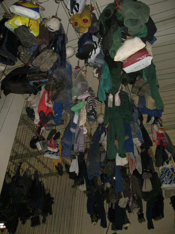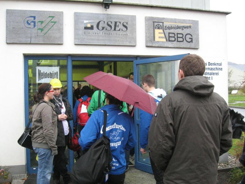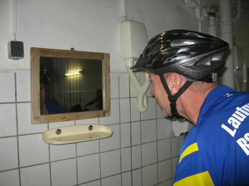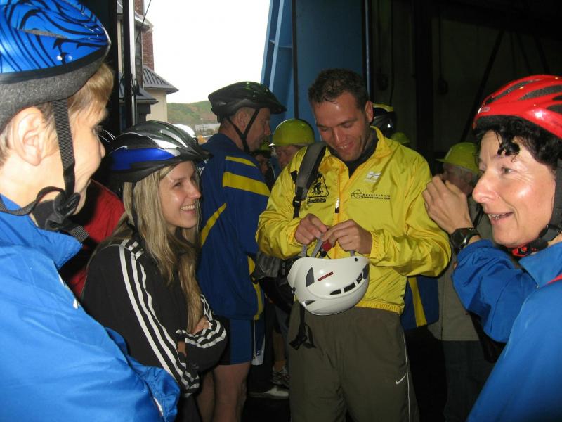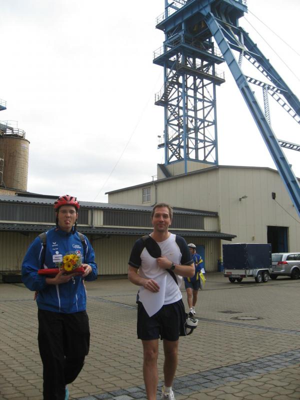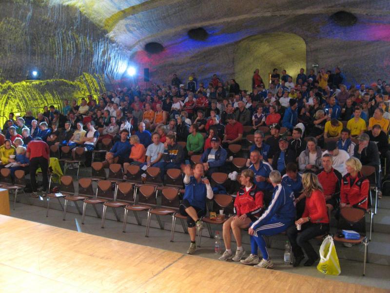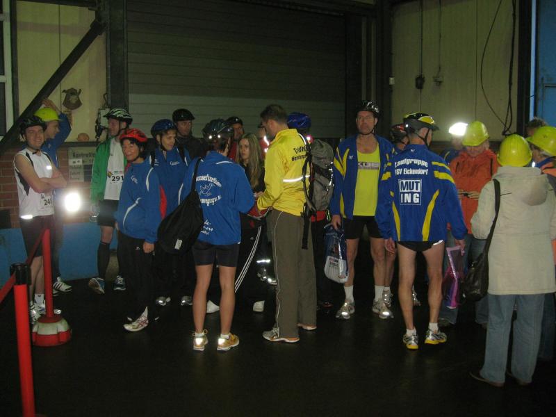Nur in leichte Laufsachen geschlüpft, hängten die Sportler ihre Kleidung an großen Haken auf. Mit einer langen Kette wurden die Sachen dann unter die Hallendecke gezogen. Wie bei den echten Bergleuten auch, ist die Kleidung nur dort vor Verschmutzung geschützt. Weiterhin ausgerüstet mit Helm und Grubenlampe, eilten die Läufer durch das feuchtkalte Herbstwetter zum Brügman-Schacht. Der Förderkorb ließ nicht lange auf sich warten und schon bald wirbelte die 30 Grad warme Abluft vorbei. Nach drei Minuten Abwärtsfahrt bis auf 680 m Tiefe, eröffnete sich den Teilnehmern ein Erlebnisbergwerk der Superlative. Die musikalische Begrüßung durch die Bergmannskapelle nahmen die noch tauben Ohren nur gedämpft wahr. Aber den Sportlern und gut 150 Zuschauern blieb noch genug Zeit zur Akklimatisierung.