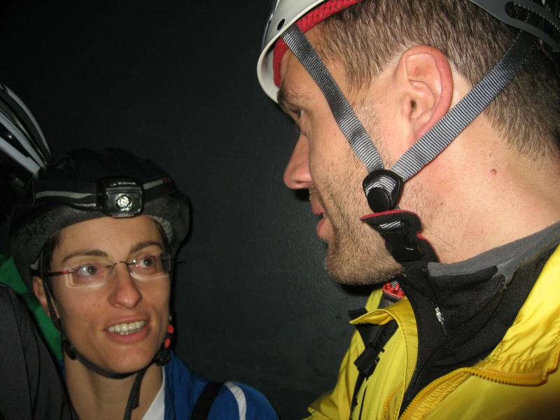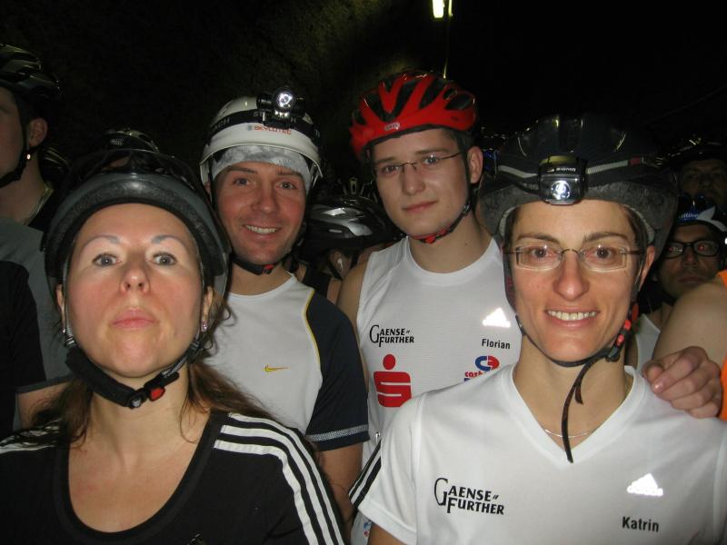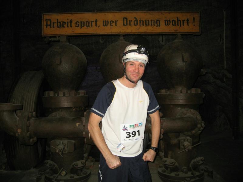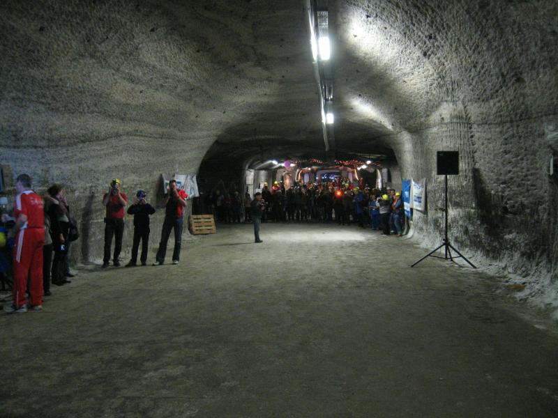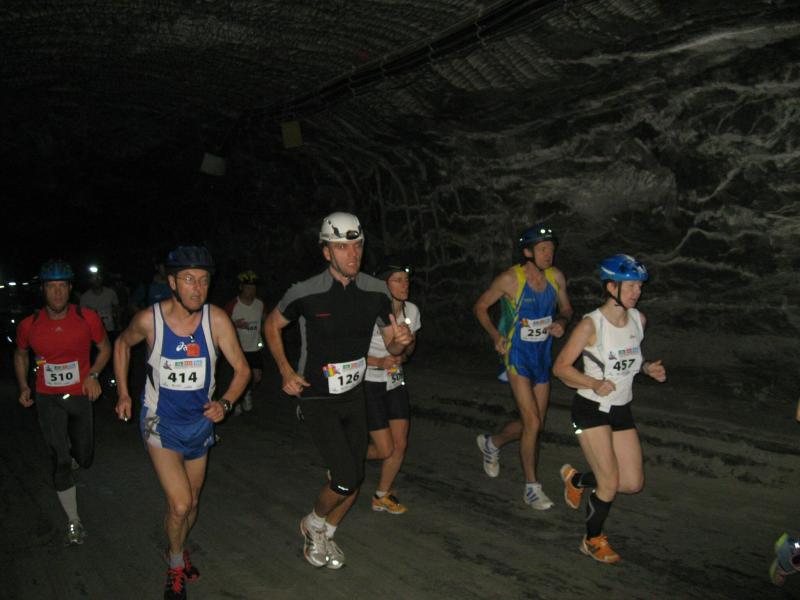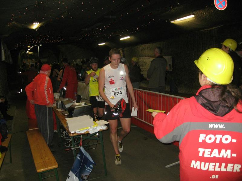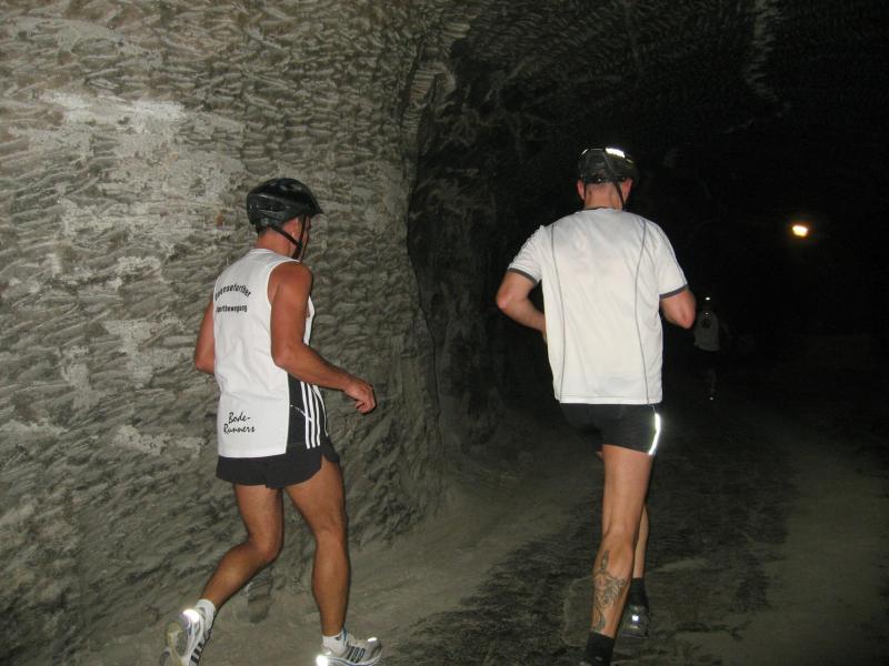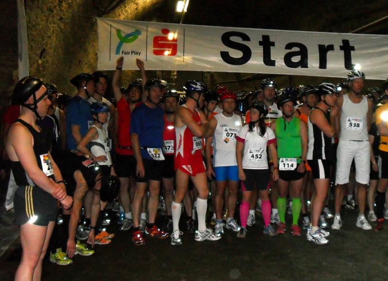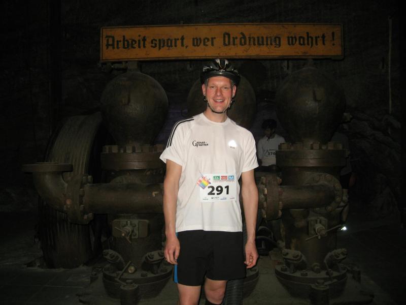 Um 11.00 Uhr waren dann alle 479 Starter bereit für das große Abenteuer. Eine gemessene Luftfeuchtigkeit von 23,5 Prozent, was einem Lauf in der Wüste entspricht, Temperaturen zwischen 28 bis 37 Grad Celsius, extrem glatte Salz-Passagen und die Steigung der sogenannten „Mauer“ mit 24 Prozent, sollte einem harten Bergmann-Arbeitstag entsprechen können. Verhalten gingen die Bode-Runners an die erste Fünf-Kilometer-Runde. In den spärlich beleuchteten Gängen hallte es: „Anja? Ja! Lutz? Ja! Dirk? Ja! Mike? Ja! Dann kam die Mauer: Kleine Schritte, die Arme schwangen kontrolliert mit, gleichmäßig tiefe Atemzüge, der Puls schlug bis unter den Helm, im Lichtkegel rieselte der Salzstaub. Nach gut zwei Kilometern Steigung: „Anja?“ Mehr bekam Sabine nicht raus. Keine Antwort. An der Trinkstelle schluckten die Läufer dankbar das gereichte Wasser. Einen Becher noch über den Kopf, irgendwie schmeckte jetzt alles salzig. Auf dem langgezogenen Plateau kamen die Läufer wieder zu Luft. Die letzten zwei Kilometer der ersten Runde ging es bergab. Nur mit Lampe und gutem Laufschuh war ein rasantes Tempo möglich. Wer im Dunkeln tappte oder ängstlich auf die glänzenden Salzstellen reagierte, schaltete lieber einen Gang runter. Vorbei an der riesigen Frischluftanlage, stieg den Läufern die Würstchenluft aus der unterirdischen Gastronomie in die Nase. Nun war es nicht mehr weit und 150 Zuschauer puschten die tropfenden Läufer in die zweite Runde. Bevor es wieder an die Mauer ging, verlangte der Körper noch einmal Wasser. Während manche gleich in den schnellen Schritt wechselten, hatten andere nur ein Ziel: Nicht stehen bleiben! Langsam aber beständig ging es wieder nach oben. Hitzestau, der Kopf und die Beine drohten zu platzen, Helm und Lampe nervten nur noch, man hatte das Gefühl die Decke fällt einem auf den Kopf. Gänsehaut pur, als die Kuppe endlich erreicht war. Ja!!! Los, nach Hause!