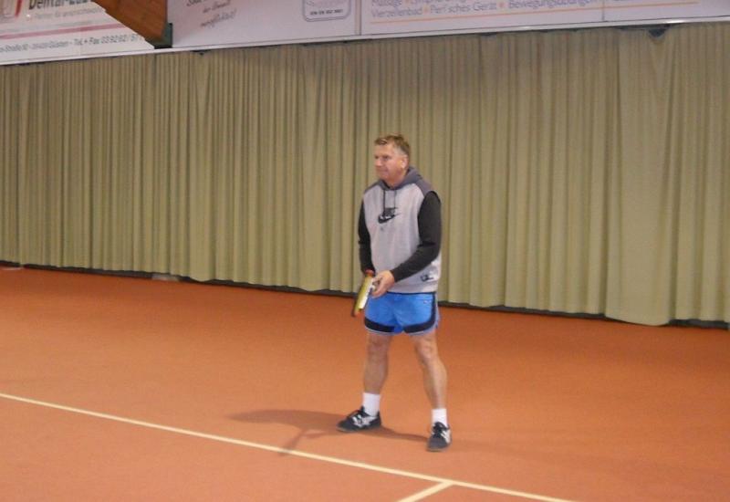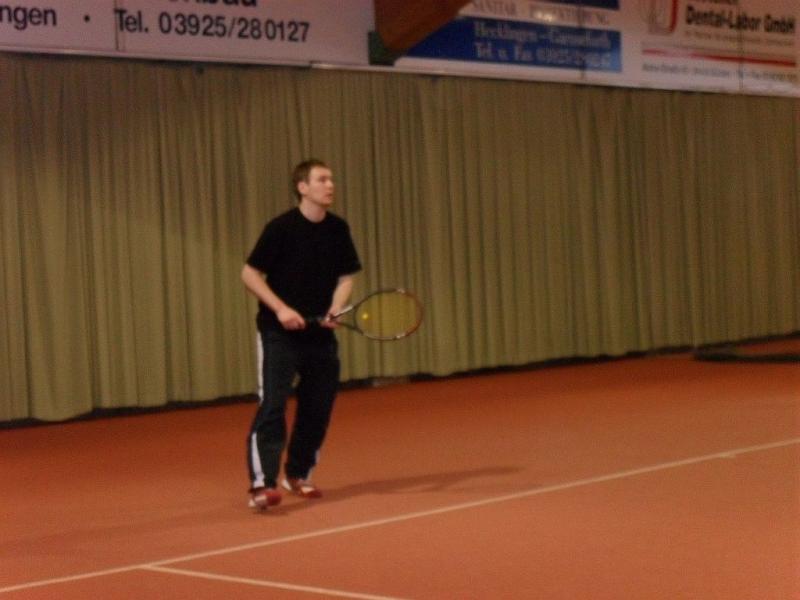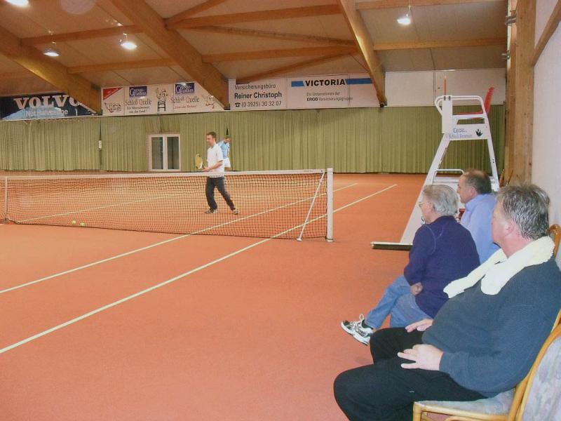 Im Vorfeld haben sich Doppelpartner gefunden, die über das gesamte Turnier gemeinsam antraten. Es spielten alle Doppel einmal gegeneinander, was insgesamt 21 Partien bedeutete, die jeweils nur über den langen Satz (Match-ende bei neun) ausgetragen wurden. Friedrich/Prüfer gaben keinen einzigen Satz ab und verließen den Court sechsmal als Sieger. Brian Dressler/Sebastian Haberecht (Grün Weiß Aschersleben) verbuchten fünf Siege, denn Friedrich/Prüfer ließen den beiden beim 9:4 keine Chance. Das spannendste Match lieferten sich Frank Müller/Ronny Selig und Manfred Rademann/Andreas Trensinger (alle Gaensefurth). Trensinger, der nach einer Verletzungspause wieder in den Spielbetrieb einstieg, legte mit seinem Partner einen Fehlstart hin. Das Duo lag schnell mit 2:7 zurück, drehte dann aber die Partie noch. Sie wehrten einen Matchball ab und siegten 9:8. Für Trensinger/Rademann bedeutete der Erfolg den dritten Platz.