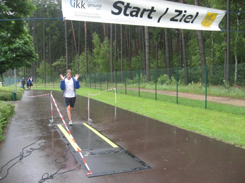 Im Feld der 7,2 Kilometerläufer trafen die Bode-Runners auf viele Eickendorfer Starter. Es reichte aber meist nur zu einem freundlichen „Hallo“, denn Matsch, Pfützen, Tannenzapfen und Wurzelwerk erforderten die ganze Aufmerksamkeit der Läufer. Bevor das Ziel erreicht wurde, goss es wieder aus allen Wolken. Davon bekam die Langdistanz dann noch ordentlich was ab. Kein Hindernis für Lutz Klauß, der sich von Wettkampf zu Wettkampf an Jens-Uwe Börner herantastet. „JUB, bald hab ich dich!“ neckte er im Ziel den Gejagten.
