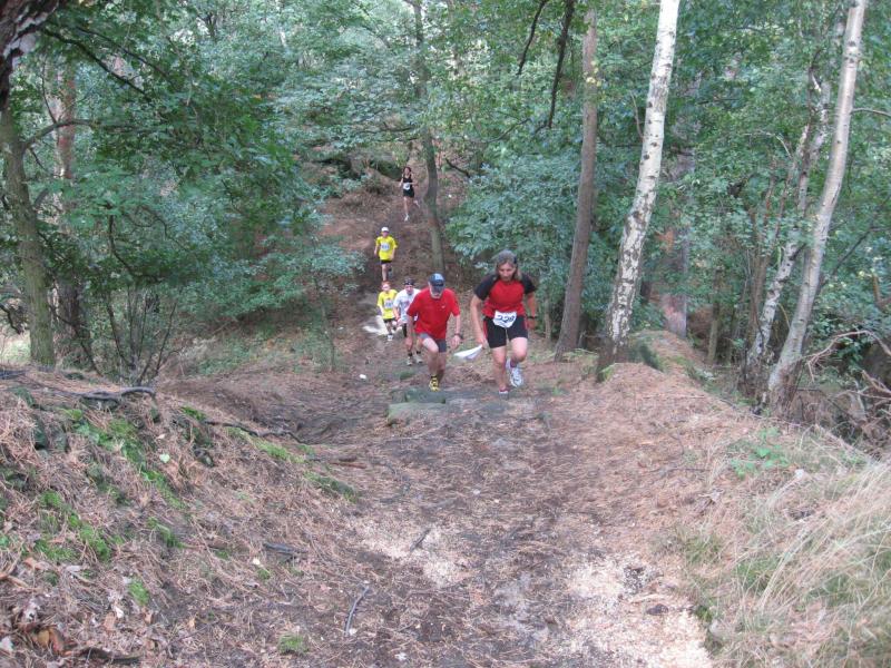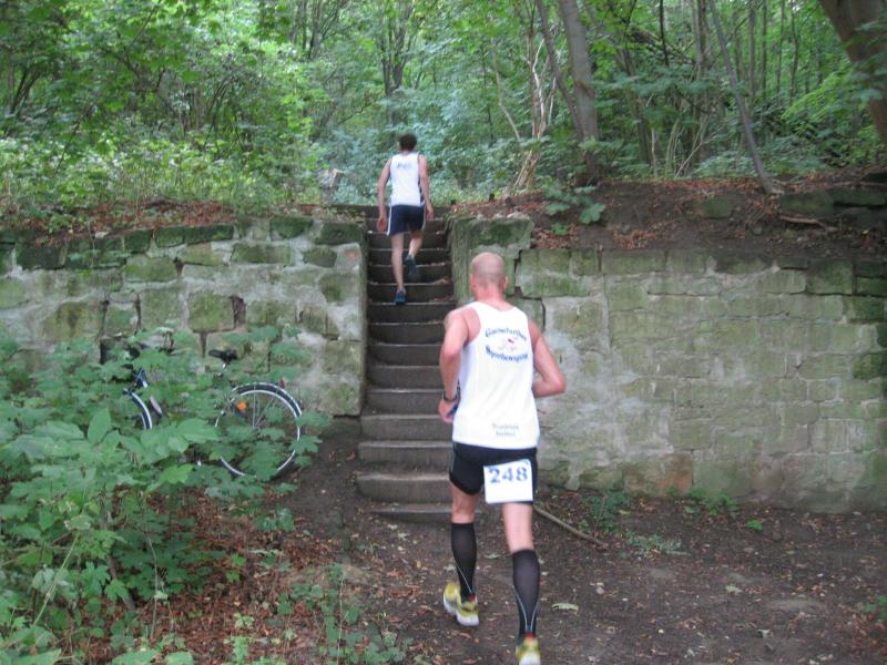 Spätestens mit dem Startschuss über 13 Kilometer waren die Gedanken an den bevorstehenden Muskelkater verschwunden und langsam reihte man sich im Tross der Laufverrückten ein. Die ersten sechs Kilometer verliefen in leichten Wellen, bevor die berüchtigte Treppe hinauf zum Gläsernen Mönch den Lauf abrupt stoppte. Quasi im Gänsemarsch zog sich die Menschenkette pustend die 230 Stufen hinauf, bis ein Mann im Mönchsgewand mit kühlem Nass und Bibel das Ende der Qual erahnen ließ. „Bitte lieber Gott, heile mich von dieser Laufkrankheit!“, konnte man vielen Gesichtern scheinbar entnehmen. Aber weit ab vom Start ging der Weg nur weiter und das zum Glück dann auch bald wieder bergab. Unaufmerksam und wie immer der Fotografie verfallen, stürzte Jens-Uwe Börner über eine Wurzel und konnte nun eine Wunde am Knie sein eigen nennen. Zu diesem Zeitpunkt gab er dann auch Schmidtschneiders Verfolgung auf, widmete sich ganz seinem Hobby und hakte den Lauf als gute Trainingsvorbereitung für den Magdeburg-Marathon ab.