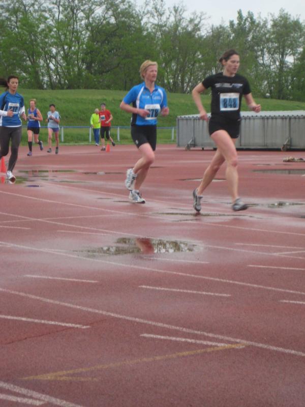 Leider verregnete ein plötzliches Tief dieses gut geplante Event. Die Tartanbahn war nass und die Lufttemperatur etwas zu kühl. Isa Höber und Annegret Wille (beide w45) meldeten sich als einzige des Vereins für die Landesmeisterschaft an und kreiselten die 12,5 Runden zusammen mit ihren 21 Mitstreiterinnen. Wie schon bei den Landesmeisterschaften auf der Straße in Bad Schmiedeberg überzeugte Isa Höber abermals und beendete das Rennen wieder mit Platz 3 in ihrer Alterklasse. Annegret Wille konnte den dritten Platz vom Vorjahr zwar nicht verteidigen, knüpfte aber an ihre Vorjahreszeit an und war mit Platz 5 zufrieden, da sie ihre Saisonhöhepunkte ohnehin mehr im Triathlon und Quadrathlon sieht.