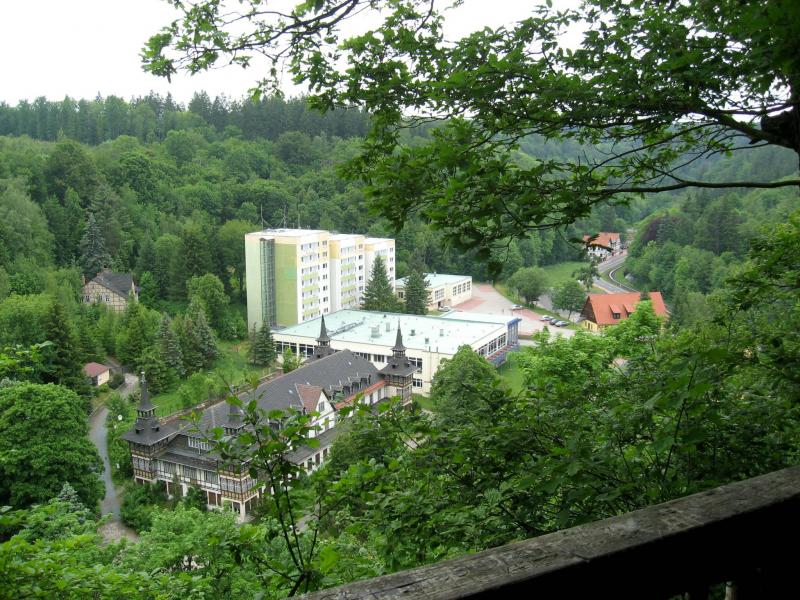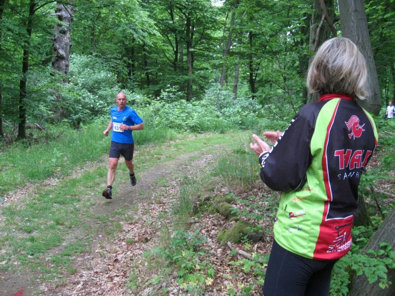 Nach verschlungenen Waldwegen passierten die 16-Kilometer-Läufer die sagenumwobene Mägdetrappe und es ging rasant bergab in Richtung Mägdesprung. Bei Sabine Börner sorgte das lose Felsgestein für einen unfreiwilligen Stopp. Zum Glück waren alle Glieder ordentlich warmgelaufen und der Abstieg konnte fortgesetzt werden. In Mägdesprung angekommen, ging es wieder 120 Höhenmeter hinauf. Geteiltes Leid ist halbes Leid dachte sich das Trio Sylvia Köhn, Lutz Klauß und Jens-Uwe Börner. Gemeinsam spornten sie sich an, machten sich Mut und kamen bald darauf über einen schmalen Klippenweg am sogenannten „Pioniertunnel“ an. Die Durchquerung des 15 Meter langen Felsdurchbruchs war nur in gebückter Haltung möglich, ein Fotomotiv wie für Börner gemacht! Am Verpflegungsstand konnten sich die Läufer noch einmal stärken, denn nun kam der Anstieg zum Birkenhäuschen. Hinab ins Steintälchen ging es wieder hinauf zum Himmelsgarten bevor die Strecke auf den letzten drei Kilometern herrlich sanft auslief. Im Zielbereich herzlich vom Publikum und Moderator empfangen, kümmerte sich ein Sportfreund „Peter“ rührend um alle einlaufenden Damenbeine. Er ließ es sich nicht nehmen, den Transponder für die Zeitmessung höchstpersönlich zu entfernen. Bis zum Zielschluss hatte sich der Regen zurückgehalten, bei der Siegerehrung schüttete es dann aber ordentlich. Aus dem schützenden Zelt, hinauf aufs Treppchen, durften wieder nur die Bode-Runner-Damen. Ina Schöler von der ZLG Atzendorf wurde ziemlich nass, denn nicht nur die Gesamtzweite bei den Damen, sondern auch der Sieg in ihrer Altersklasse verlangte nach ihrem Erscheinen. Isa Höber siegte souverän in der W 45 und Sylvia Köhn und Sabine Börner freuten sich über einen zweiten Platz in den Altersklassen W 30 und W 45.