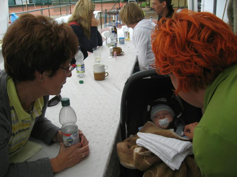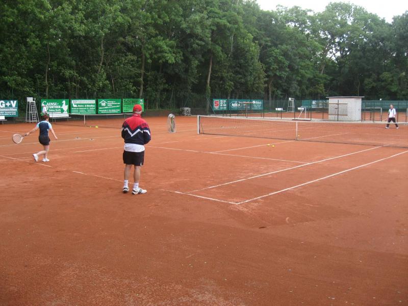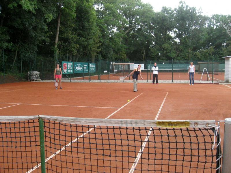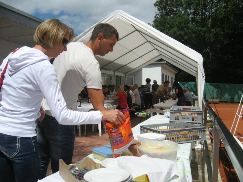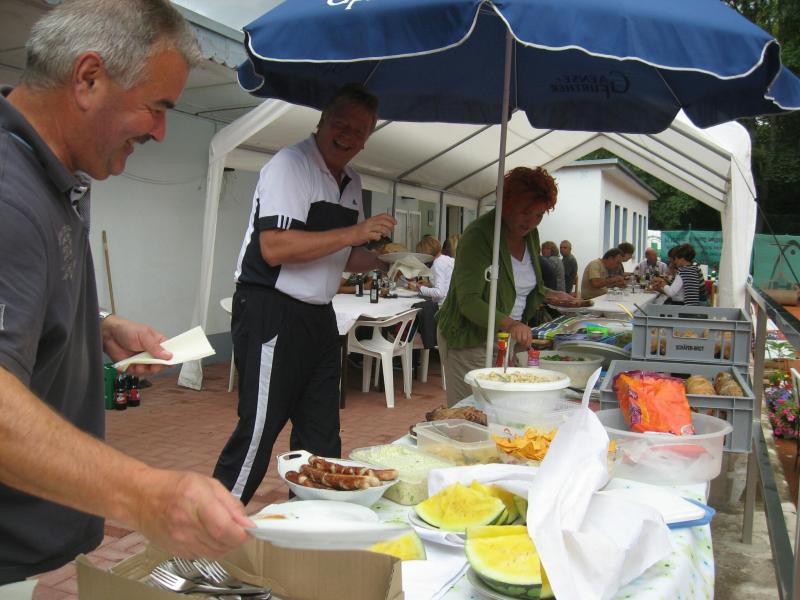 Hoch interessiert und motiviert fanden sich also Läufer und Triathleten auf den vier neu rekonstruierten Tennisplätzen ein. Vorerst bestaunte man die ebenfalls frisch sanierten Vereinsräume, waren doch die Plätze aufgrund heftiger Regenfälle noch mit großen Pfützen gespickt. Fleißige Tennisspieler waren aber bereits dabei, mit Riesenbesen die Plätze wieder bespielbar zu machen. Die Grills arbeiten dann auch bald auf Hochtouren und die Bierchen und lecker mitgebrachten Salate stimmten wohl sogar den Wettergott gnädig. Unter kompetenten Anleitungen wurde nun dem einen oder anderen Runner wohl zum ersten Mal Vor- und Rückhand erklärt. Nach ersten Aufschlagübungen und nahen Netzschlägen der Anfänger, lieferten sich Alleskönner und Profils bereits ordentliche Schmetterbälle, gekonnte Passierschläge oder Stoppbälle. Bis zum Abend hielt das rege Treiben auf den Plätzen an.