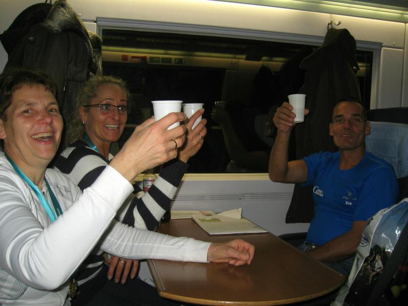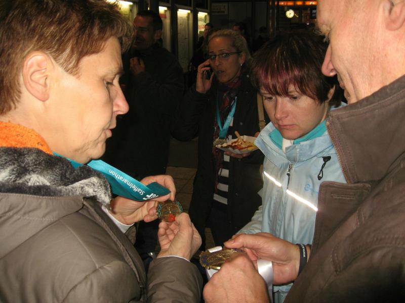 Nein, krank sind sie noch nicht! In Plastiktüten gegen die Kälte gehüllt, bibbern sie ihrem Start entgegen. Jörg Schäper, Lutz Klauß und Sabine Börner zählen in der nächsten Welle von 10 rückwärts: 9, 8, 7 … 1 – Start! Noch mehr Gänsehaut, denn nun setzten sich weitere 5.000 Läufer in Bewegung. Tolle Erfindung diese Wellenmethode! Von Anfang an haben die Sportler ausreichend Platz. Nach dem ersten Kilometer ein kritischer Blick auf die Stoppuhr – und Erleichterung, genau im Zeitplan. „Jetzt können wir endlich laufen, jetzt ist alles gut!“ Es läuft gut, zu gut, Runner`s High, ein euphorisches Hochgefühl welches die Beine immer schneller werden lässt. Mit einer irren Durchgangszeit von 01:39 Stunden passieren Meier und Börner die Halbmarathondistanz. Zeit Meier ziehen zu lassen, das Foto hatte Börner bereits im Kasten. Bei Schäper lief auch alles super, Klauß und Sabine Börner waren noch bis Kilometer elf zusammen. „Lauf dein Ding!“ schickt Sabine ihn auf die Reise „Ich schalte einen Gang runter!“ Bald überholt auch Schäper. Gut gelaunt und locker verschwindet er bis zur nächsten Verpflegungsstelle im Läufermeer. Sabine braucht keine Verpflegungsstelle. Vollgehängt mit Trinkflaschen wird beim Laufen getrunken. Reine Kopfsache, den Rhythmus nicht unterbrechen, vier Stunden durchlaufen bis zum Ziel! Während dessen hat sich Börner von den ersten 25 Kilometern langsam wieder erholt. Ob die Staffelläufer zu sehen sind? Renate Liedtke als Startläufer wurde mit der letzten Welle auf die Reise geschickt. Nach 12 Kilometern übergab sie ihren Chip an Claudia Meier, welche für sieben Kilometer die Staßfurter Läufer vertrat. Rein in den Wechselgarten und Übergabe an Sylvia Köhn. Sie muss sich die Kräfte genau einteilen, denn auf Grund des Ausfalls eines Läufers wird sie zwei Etappen bewältigen müssen. Kein Problem für Köhn, hat sie doch die fehlenden 23 Kilometer in letzter Zeit bereits öfters absolviert.