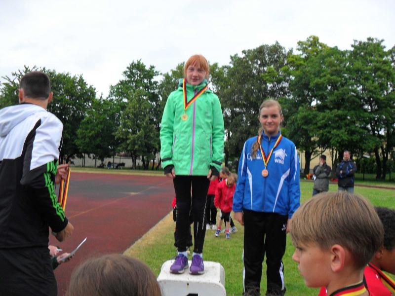 In der Altersklasse w7 waren Fabienne Sämisch und Nina Ritter aktiv. Fabienne hatte jedoch nicht ihren besten Tag, denn in 50m Lauf rutschte sie beim Start aus und alle Chancen waren dahin. Auch im Weitsprung glitt sie mit dem Fuß vom nassen Sprungbrett, wurde danach besonders vorsichtig. An eine Bestleistung war nicht mehr zu denken. Einzig der Ballweitwurf brachte ihr eine Medaille für Platz drei ein. Auch der 400m Lauf verlief nicht nach ihren Vorstellungen. Kurz davor aufzugeben, überquerte sie dann aber noch als Siebte die Ziellinie.
