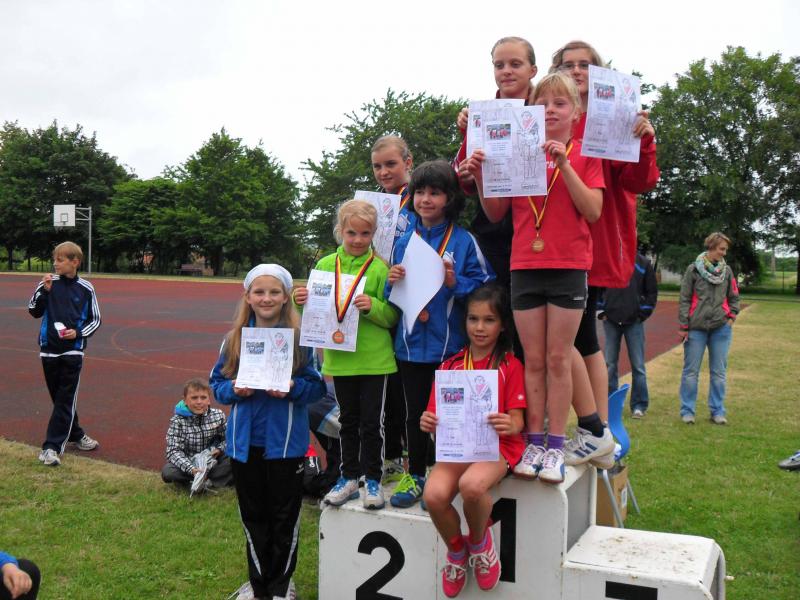 Ein besonderer Höhepunkt in Halberstadt und bei den Kindern sehr beliebt sind die Rolandstaffeln, bei denen 4x50m zu absolvieren sind. Sie setzten sich aus jeweils einem Teilnehmer der Altersklasse 8 bis 11 zusammen. Obwohl mit Fabienne und Nina (w7) nur zwei jüngere Athletinnen zur Verfügung standen,  die mit Lara (w10) und Alina (w11) ein Team bildeten, war die Begeisterung groß. Die begehrten Urkunden mit Gruppenfoto wurden dann auch für Platz zwei strahlend in Empfang genommen.